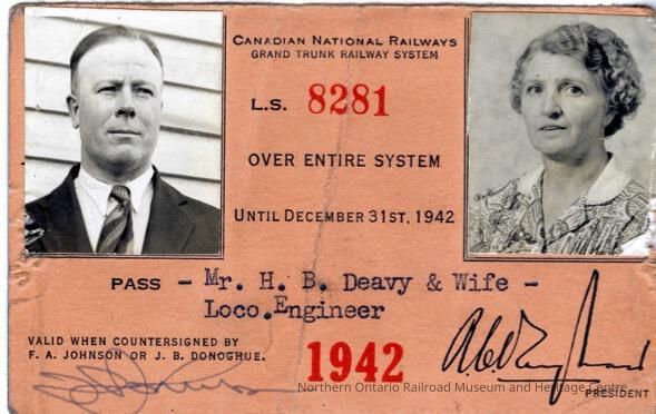 Canadian National branded entire system pass assigned to H. B. Deavy and his wife in 1942. Deavy was working as a locomotive engineer at the time and was given the pass for having worked for the company for 20 years. The pass allowed him and his wife to travel on any passenger train on the CNR lines. It was valid from 1942 until 1943.