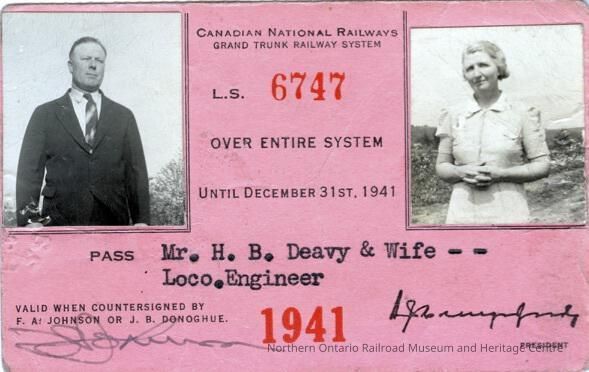 Canadian National branded entire system pass assigned to H. B. Deavy and his wife in 1941. Deavy was working as a locomotive engineer at the time and was given the pass for having worked for the company for 20 years. The pass allowed him and his wife to travel on any passenger train on the CNR lines. It was valid from 1941 until 1942.