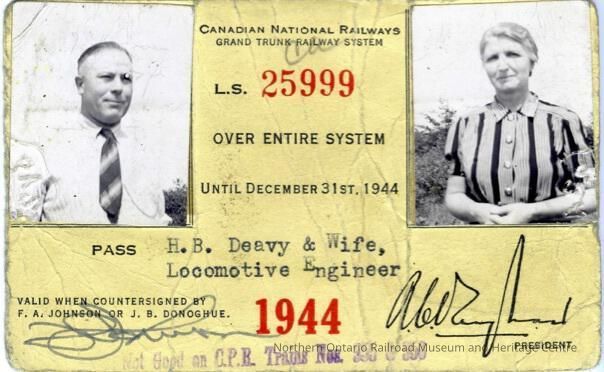 Canadian National branded entire system pass assigned to H. B. Deavy and his wife in 1944. Deavy was working as a locomotive engineer at the time and was given the pass for having worked for the company for 20 years. The pass allowed him and his wife to travel on any passenger train on the CNR lines. It was valid from 1944 until 1945.