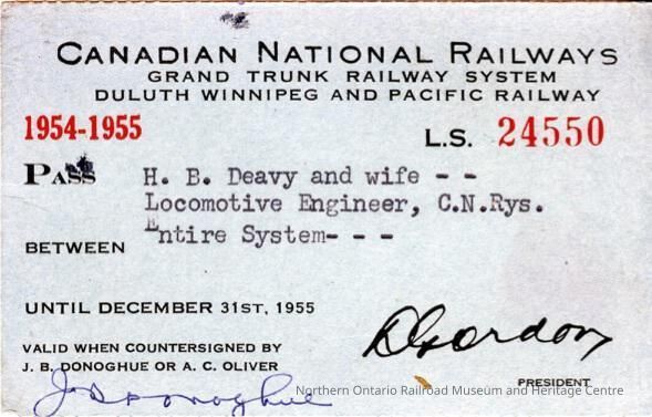 Canadian National branded entire system pass assigned to H. B. Deavy and his wife in 1954. Deavy was working as a locomotive engineer at the time and was given the pass for having worked for the company for 20 years. The pass allowed him and his wife to travel on any passenger train on the CNR lines. It was valid from 1954 until 1955.