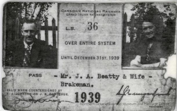 Canadian National branded entire system pass assigned to J. A. Beatty and his wife in 1939. Beatty was working as a brakeman at the time and was awarded the pass for 20 years service. The pass allowed the two to travel on any passenger train on CNR's central and western regions lines between 1939 and 1940.