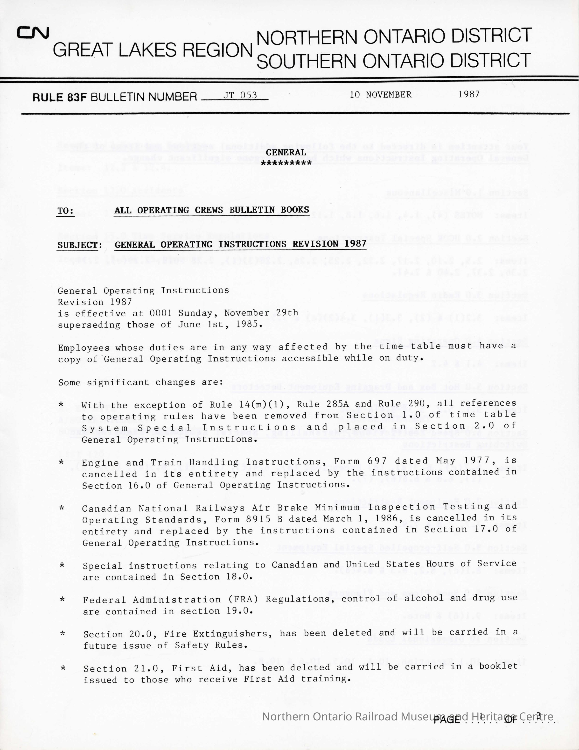 Document distributed by Canadian National to the Great Lakes Region, both the Northern Ontario and the Southern Ontario districts. The document contains revisions for general operating instructions and discusses the changes in policy and procedure surrounding operating instructions.