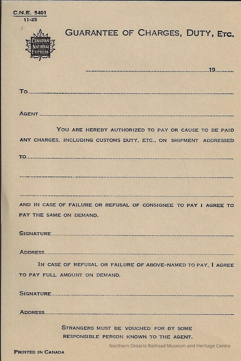 Original document distributed by Canadian National to guarantee that the consignee would cover the cost of charges related to customs and duty.