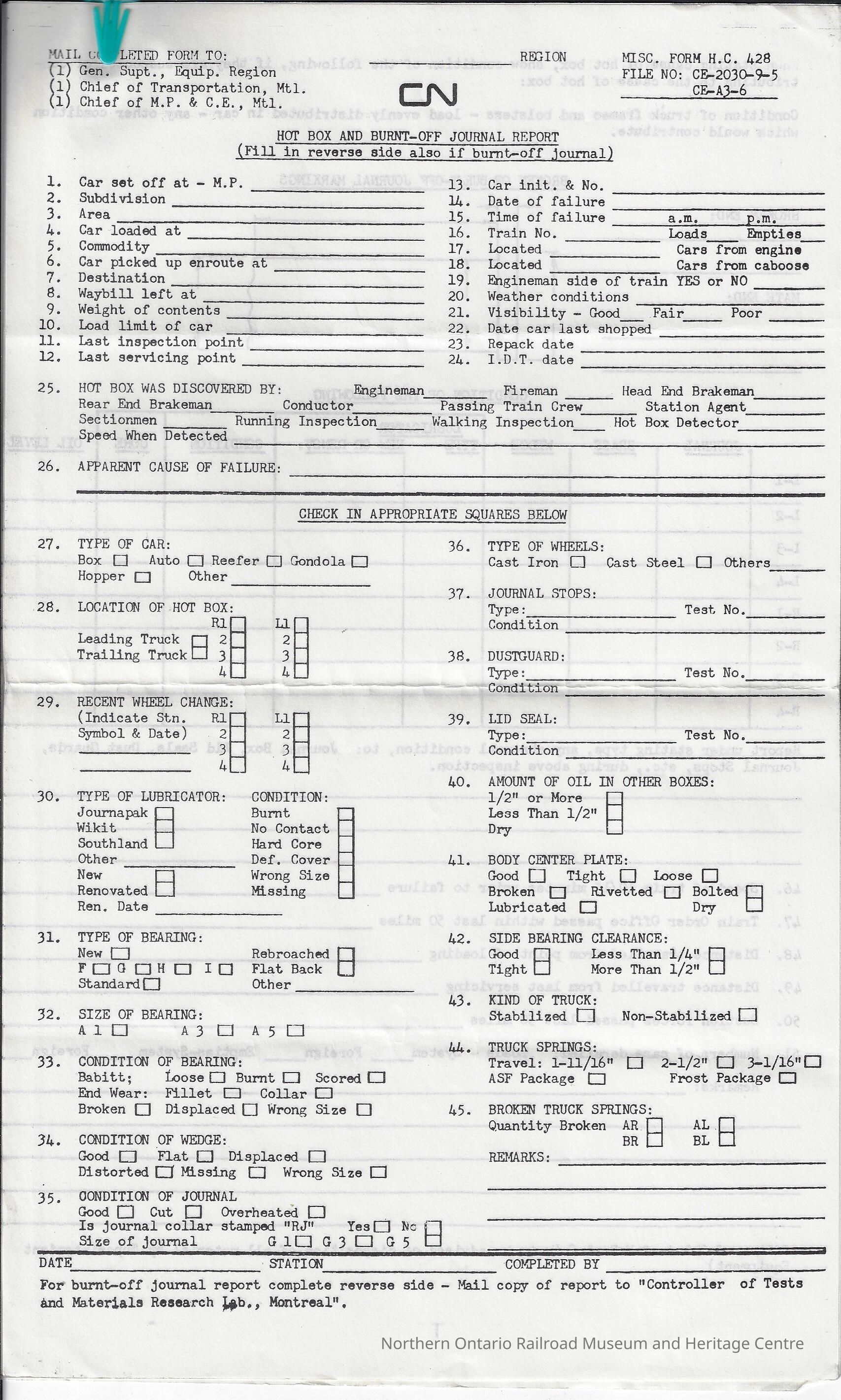 Canadian National branded hot box and burnt-off journal report. The report is blank however it features the areas to record: region, car set off at, subdivision, area, car loaded at, commodity, car picked up enroute at, destination, waybill left at, weight of all contents, load limit of car, last inspection point, last servicing point, car initial and number, date of failure, time of failure, train number, location from engine and caboose, engineman side of train, weather conditions, visibility, date car last shopped, repack date, IDT date, hot box discovered by, apparent cause of failure, type of car, location of hot box, recent wheel changes, type of lubricator, condition, type of bearing, size of bearing, condition of bearing, condition of wedge, condition of journal, type of wheels, journal stops, dustguard, lid seal, amount of oil in other boxes, body center plate, side bearing clearance, kind of truck, truck springs, broken truck springs, remarks, date, completed by, broken end, mate end, journal, brass, wedge, type, new or renov, condition, core, oil level.