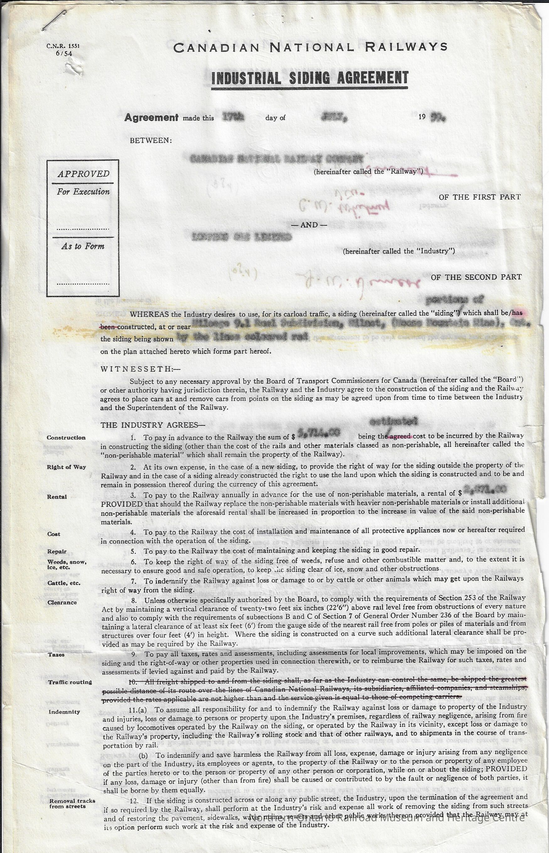 Formal agreement for the construction of industrial siding by Canadian National for the use of Lowphos Iron Ore. The agreement states the conditions for the contract as well as which party is responsible for what.