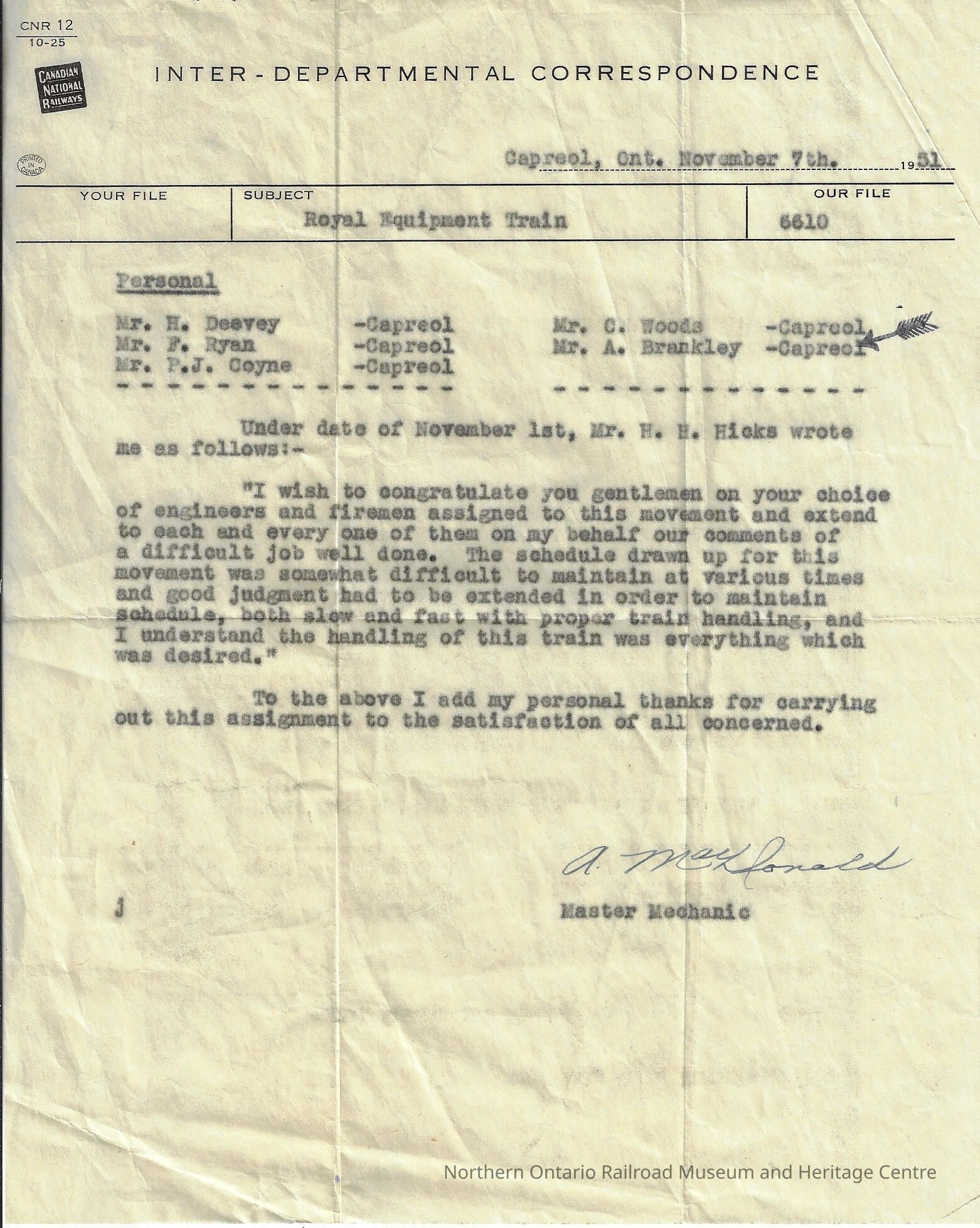 Interdepartmental correspondence on Canadian National official letterhead from A. MacDonald, a master mechanic to H. Deavey, F. Ryan, P. J. Coyne, C. Woods, and A. Brankley in Capreol, Ontario in 1951. The correspondence is a congratulations message sent to the above mentioned workers for being selected to work on the royal equipment train and for doing such an excellent job.Context