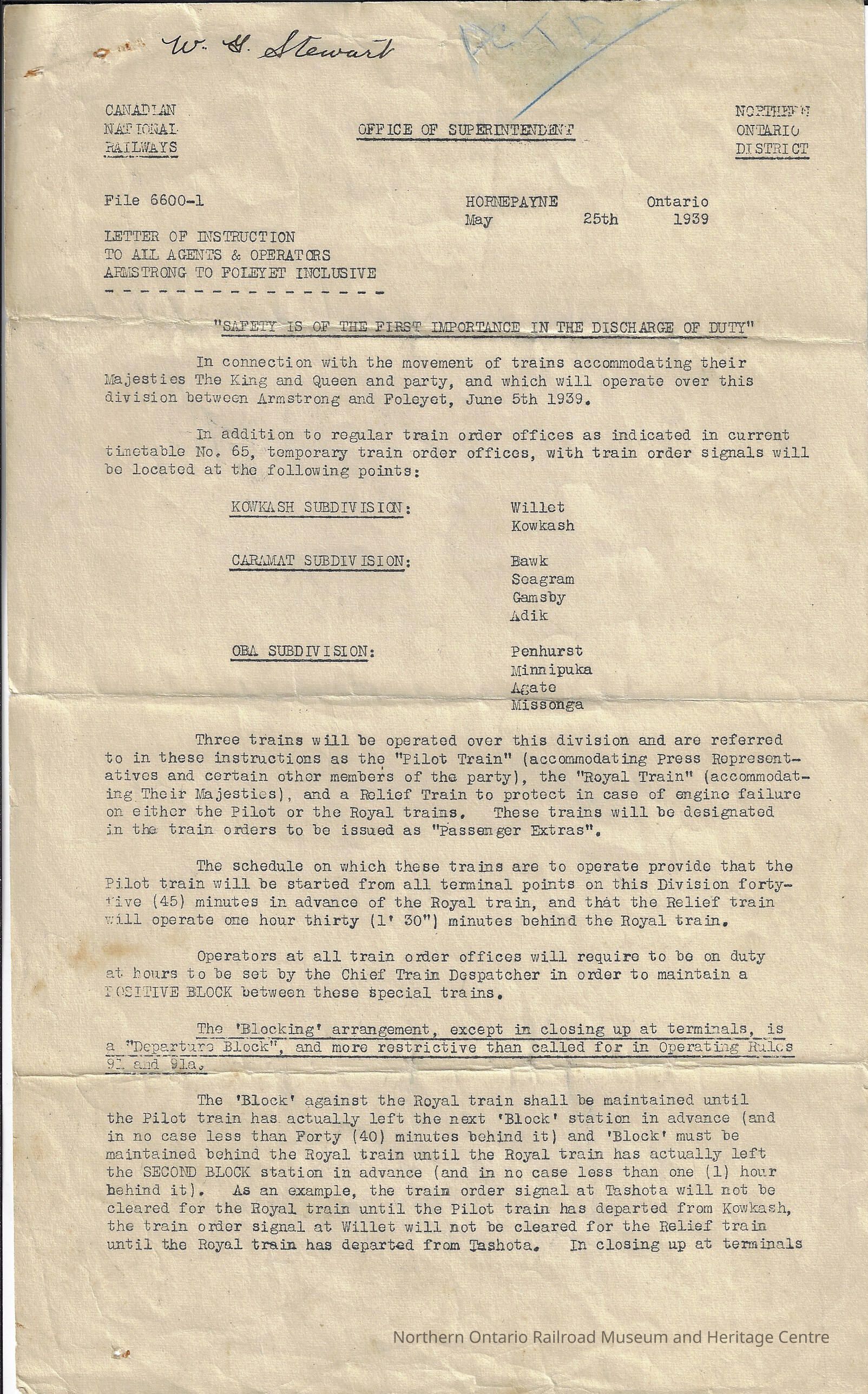 Letter of instruction provided by the office of the superintendent of the Northern Ontario District. The instructions pertain to Hornepayne, Armstrong, and Foleyet areas. The reason for the instructions are to prepare for the upcoming Royal Tour of Canada in 1939. The operating schedules accommodate three trains at all times for the royals: the pilot train, the royal train, and the relief train. The pilot train accommodates the press, reporters, representatives, and other party members. The royal train accommodates their Majesties. The relief train protects the other two in case of engine failure.