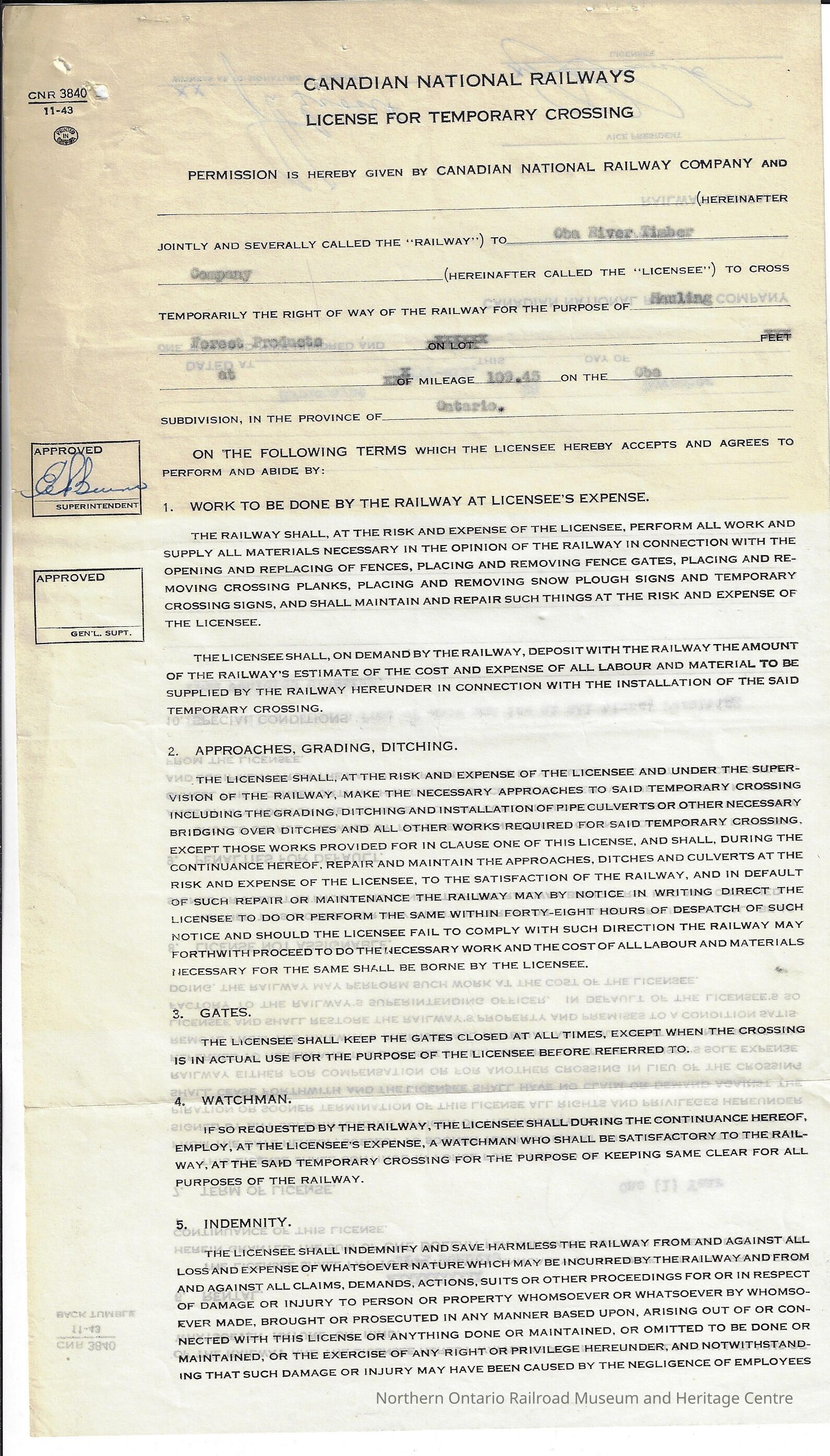 Canadian National License for Temporary Crossing: Oba River Timber Company Mile 109.45Entry/Object ID