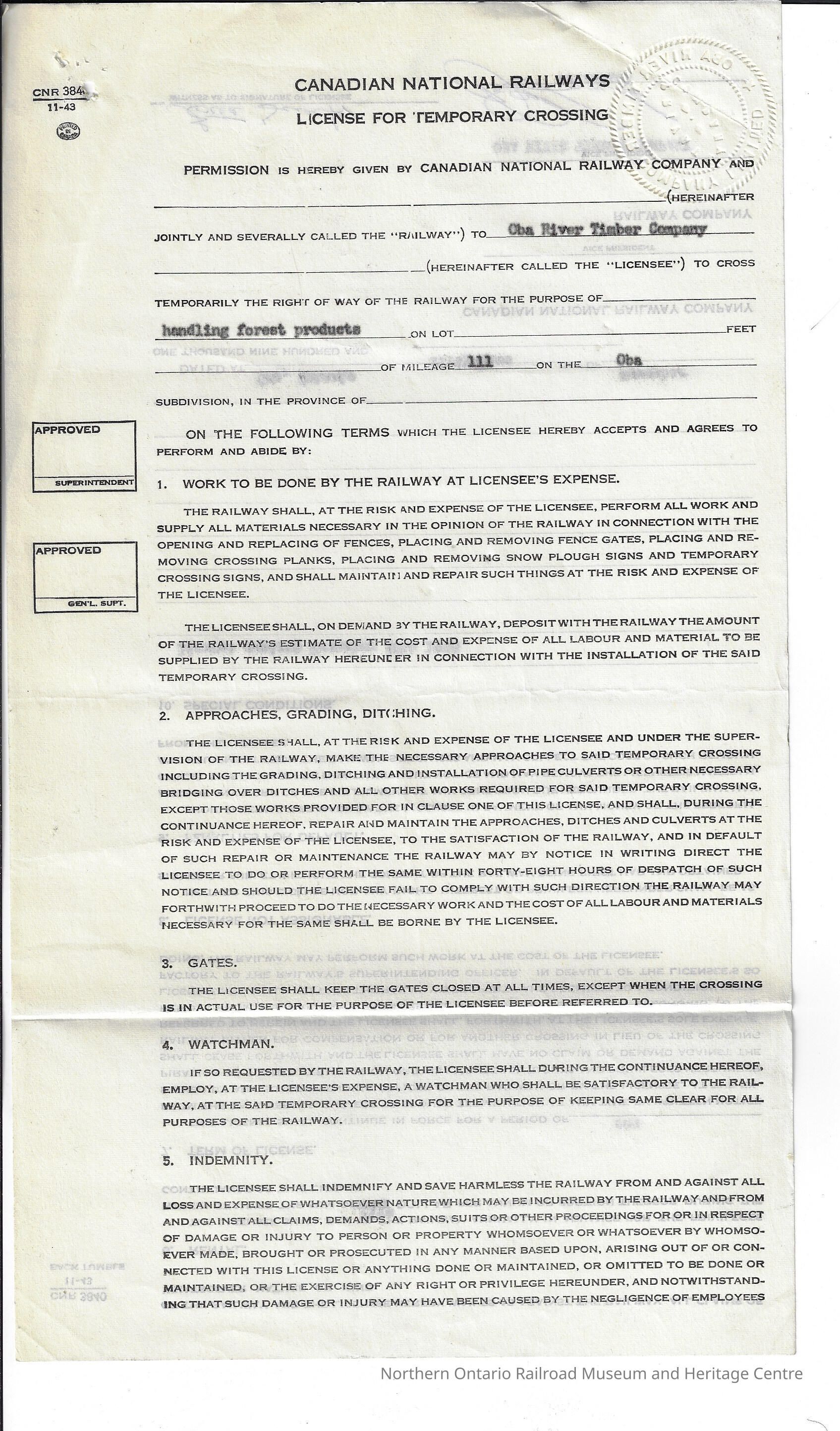 Canadian National License for Temporary Crossing: Oba River Timber Company Mile 111Entry/Object ID