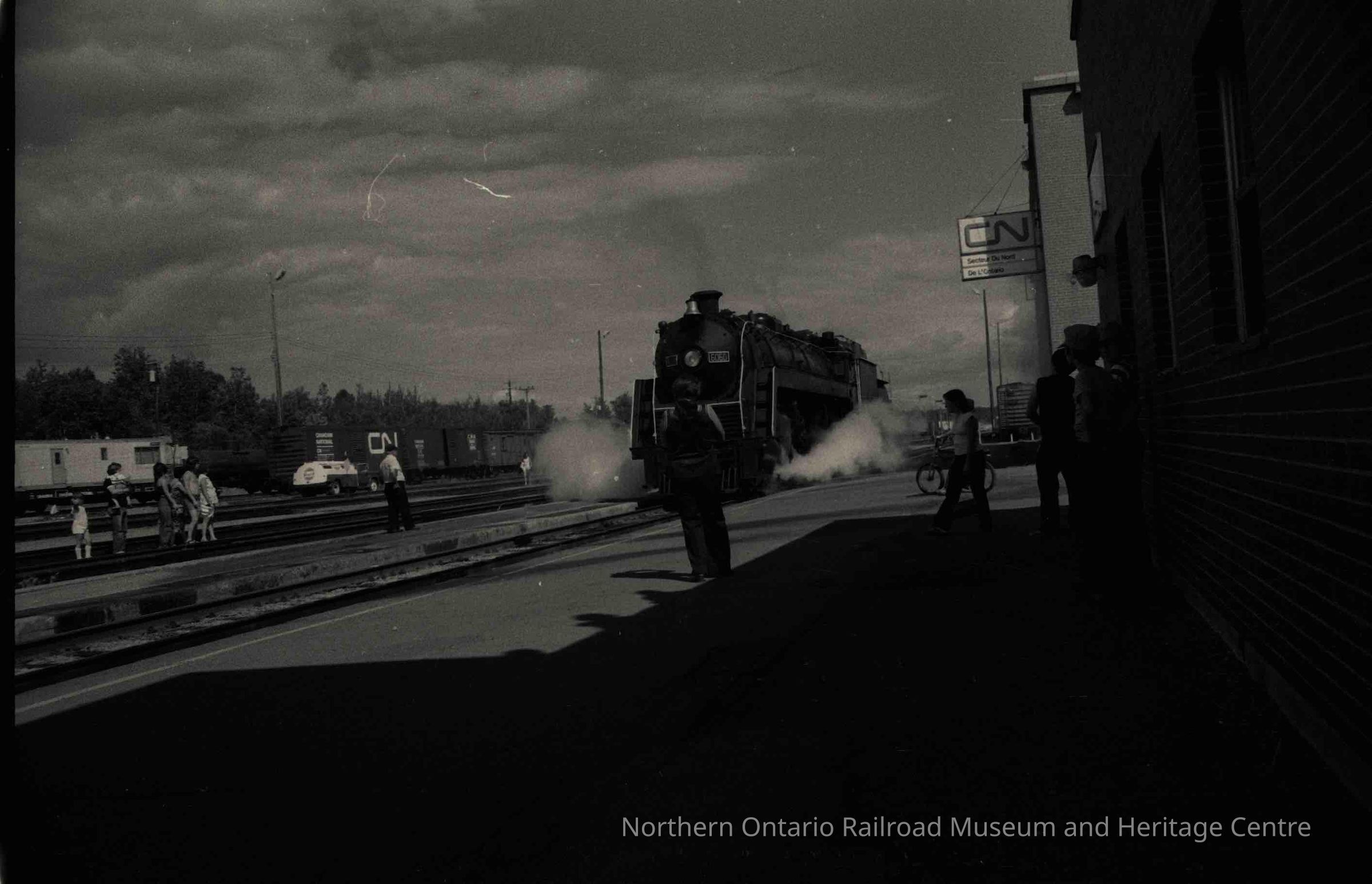 Black and white photograph showing Canadian National Steam Locomotive #6060 either pulling into or out of the station in Capreol, OntarioPhotograph Details