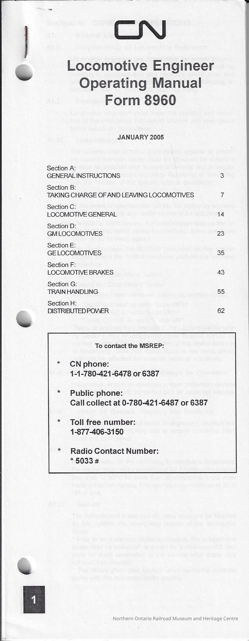 Booklet, operating manual provided to locomotive engineers. The manual is on Form 8960. The manual covers: general instructions, taking charge and leaving locomotives, General Motor Locomotives, General Electric Locomotives, Locomotive brakes, train handling, distributed power.