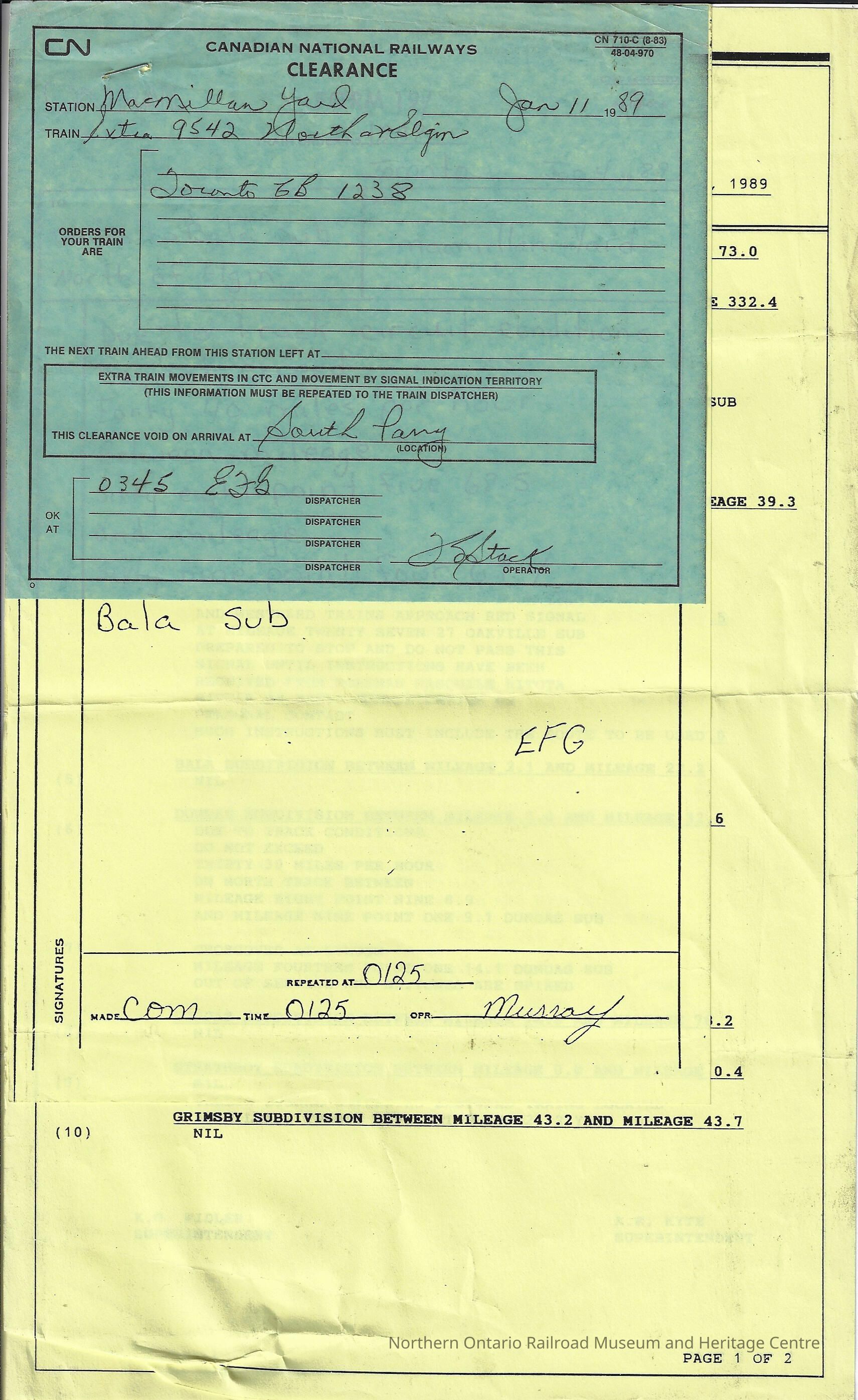 Compilation of forms instructing on trains going through the Bala subdivision, North of Elgin on January 4th, 1989. The first form is a clearance form, instructing train: extra 9542 North of Elgin and the orders are "Toronto GB 1238," the clearance is void once it arrives at South Parry. The second pages is Form 19, for train orders, the orders are for: trains to the Bala subdivision North of Elgin at the Macmillan Yard, they are told that: due to track circuit conditions do not exceed forty 40 miles per hour between mileage sixty eight point five 68.5 and mileage sixty nine point four 69.4 Bala sub, it is repeated at 0125. The third form is the daily operating bulletin for the Great Lakes Region on January 11th, 1989, which includes the Bala Subdivision.