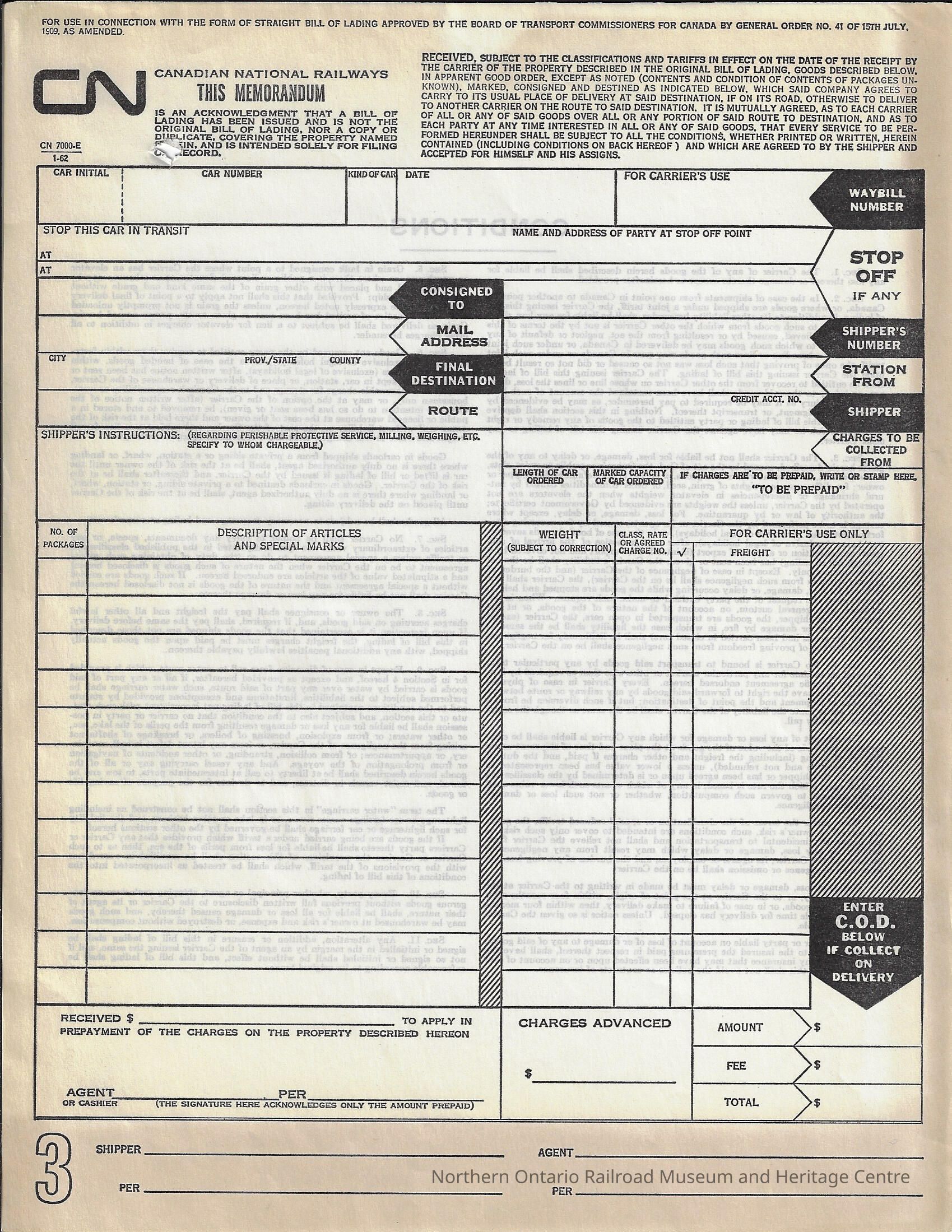 Form, memorandum of agreement for a bill of lading. On the reverse side of the form, the conditions of the memorandum are listed. The form itself is blank however it has the areas to record: car initial, car number, kind of car, date, waybill number, consigned to, mail address, final destination, route, stop off (if any), name and address of party at stop off point, shipper's number, station from, shipper, charges to be collected from, shippers instructions, length of car ordered, marked capacity of car ordered, if charges are to be prepaid mark "prepaid", number of packages, description of articles and special marks, weight, calls rate or agreed charge number, payment received, agent signature and date, charges advanced, amount, fee, total, shipper signature, agent signature.