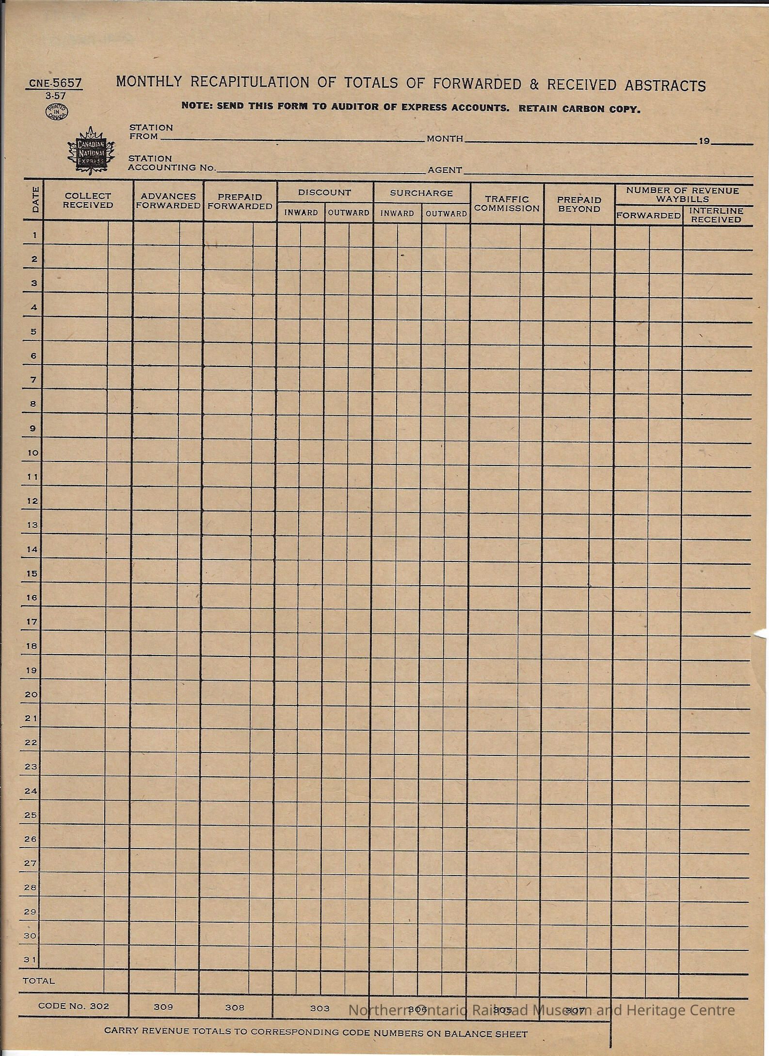Document, Canadian National branded monthly recapitulation of totals of forwarded and received abstracts. The form is blank however it has the areas to record:
