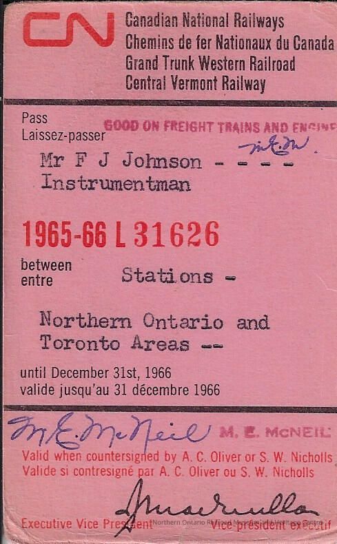 Original document belonging to Fred Johnson. The pass allowed Johnson to travel on any passenger or freight train throughout the Northern Ontario District and Toronto Areas between 1966 and 1967. Fred Johnson was working as an instrumentman at the time.