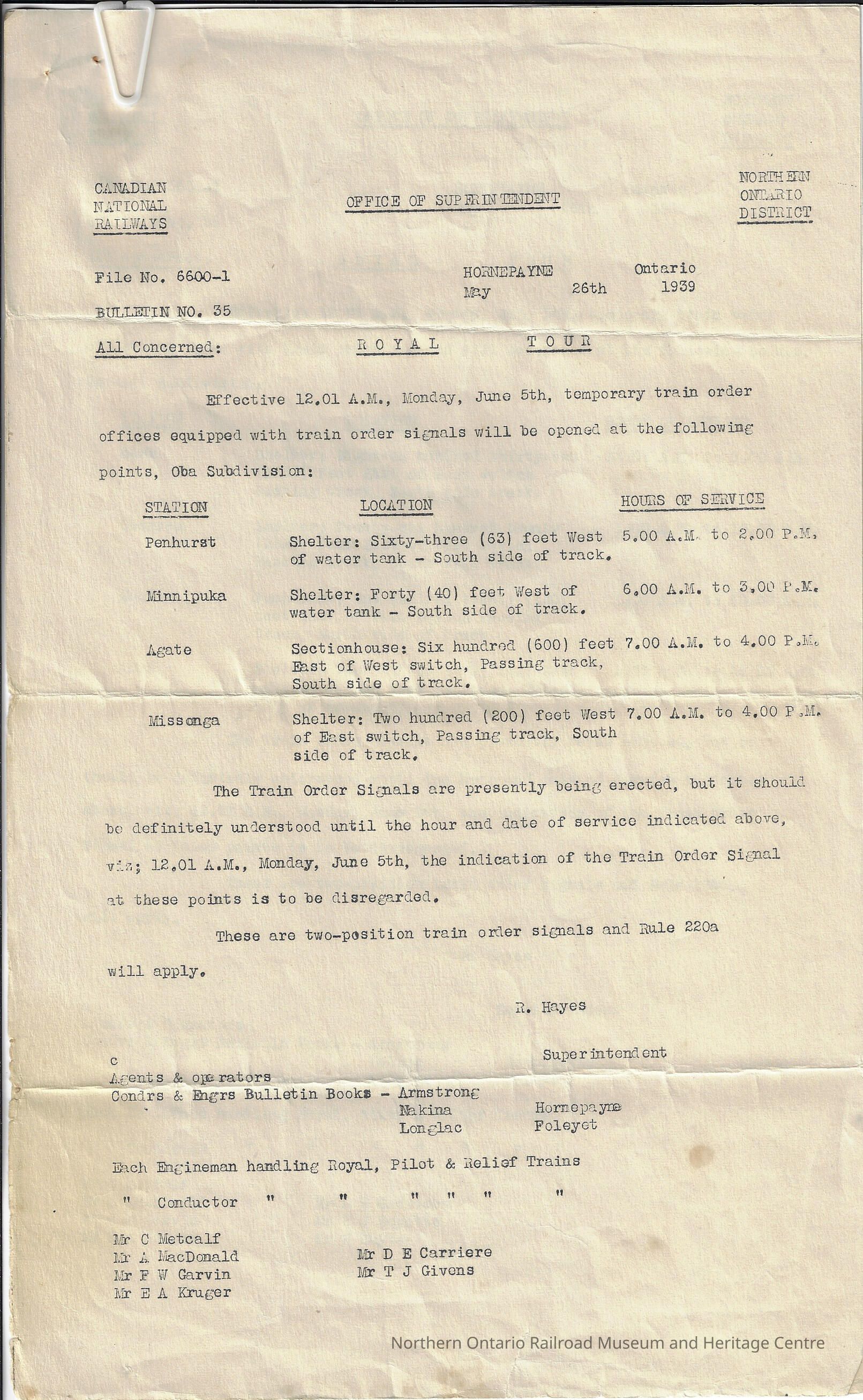Canadian National: Northern Ontario District Bulletin No. 35-37 in Hornepayne ON, May 26 1939 Re: Royal TourEntry/Object ID