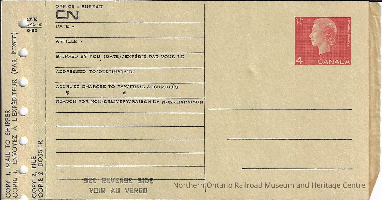 Form, Canadian National express freight services notice of non-delivery. The back of the notice explains how the shipment was not delivered and the steps that need to be taken. The form is blank but has the areas to record: date, article, date it was shipped, where it was addressed to, accrued charges to pay, reason for non-delivery.
