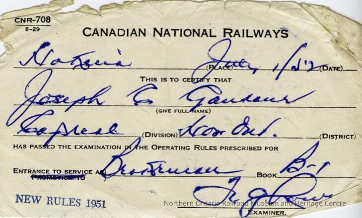 Canadian National branded operating rules instruction certificate. The certificate was given to Joseph C. Gaudaur in 1952 for completing and passing his examination on operating rules book B-1 for promotion to brakeman.