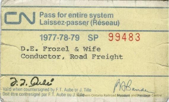Canadian National branded pass for entire system issued to D. E. (Douglas) Frozel and his wife (Roberta) in 1977. Frozel was working as a conductor at the time and the pass was granted to him and his wife, allowing them to travel on any passenger train on the entire CN system. It was valid until 1979.