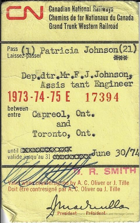 Canadian National branded pass assigned to Patricia Johnson, daughter of Fred Johnson. The pass allowed Patricia to travel between Capreol and Toronto between the years 1973-1975. Her father, Fred Johnson was an assistant locomotive engineer.