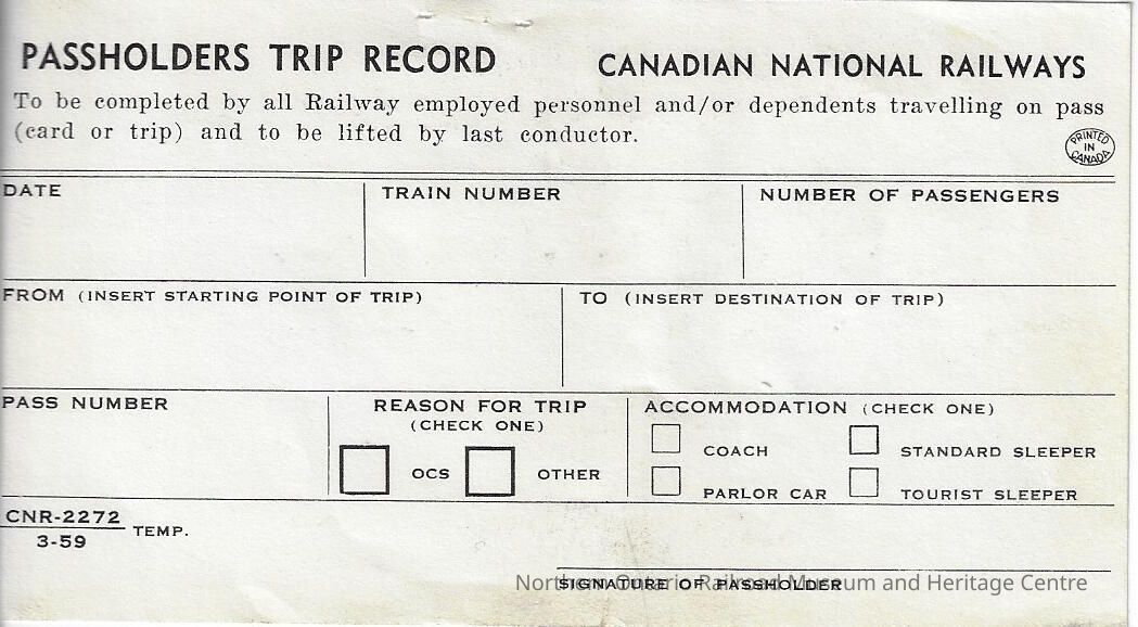 Canadian National branded passholders trip record. This form was used to record all trips taken by both the railway employee and their dependents when traveling with either a pass card or a pass trip ticket.