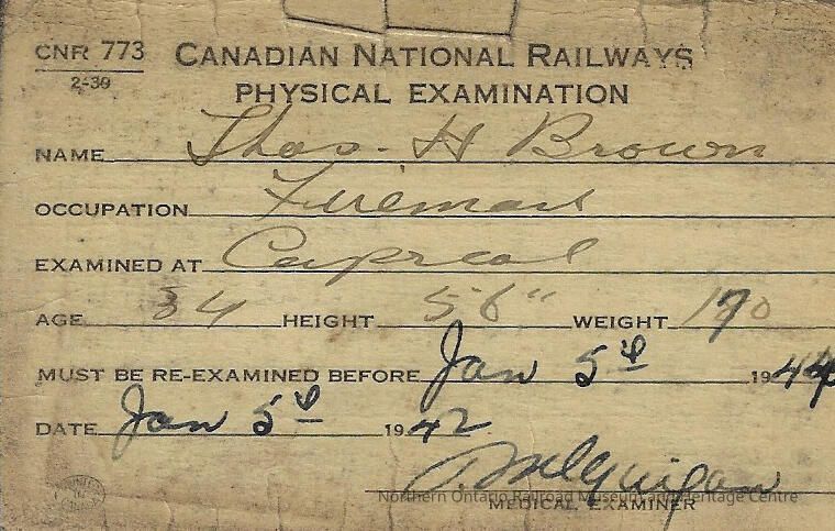 Canadian National, T. H. (Thomas) Brown, Physical Examination Card, Capreol, OntarioScope and Content