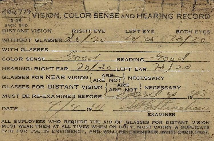 Canadian National: Physical Examination Card, Vision, Colour Sense, and Hearing Record, T. H. Brown, 1942Entry/Object ID