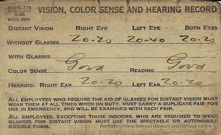 Canadian National: Physical Examination Card, Vision, Colour Sense, and Hearing Record, Thomas H. Brown, 1939Entry/Object ID