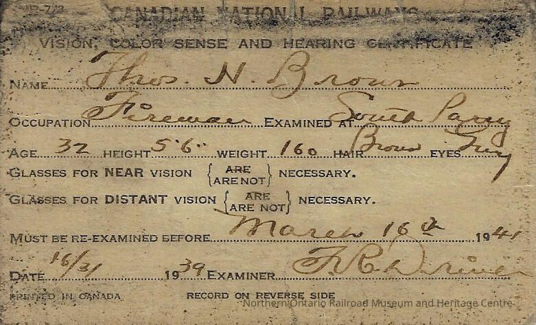 Canadian National branded employee's physical examination card belonging to Thomas H. Brown. The examination was for his vision, colour sense, and hearing. It was completed on March 16th, 1939 and he was due for another examination on or before March 16th, 1941.