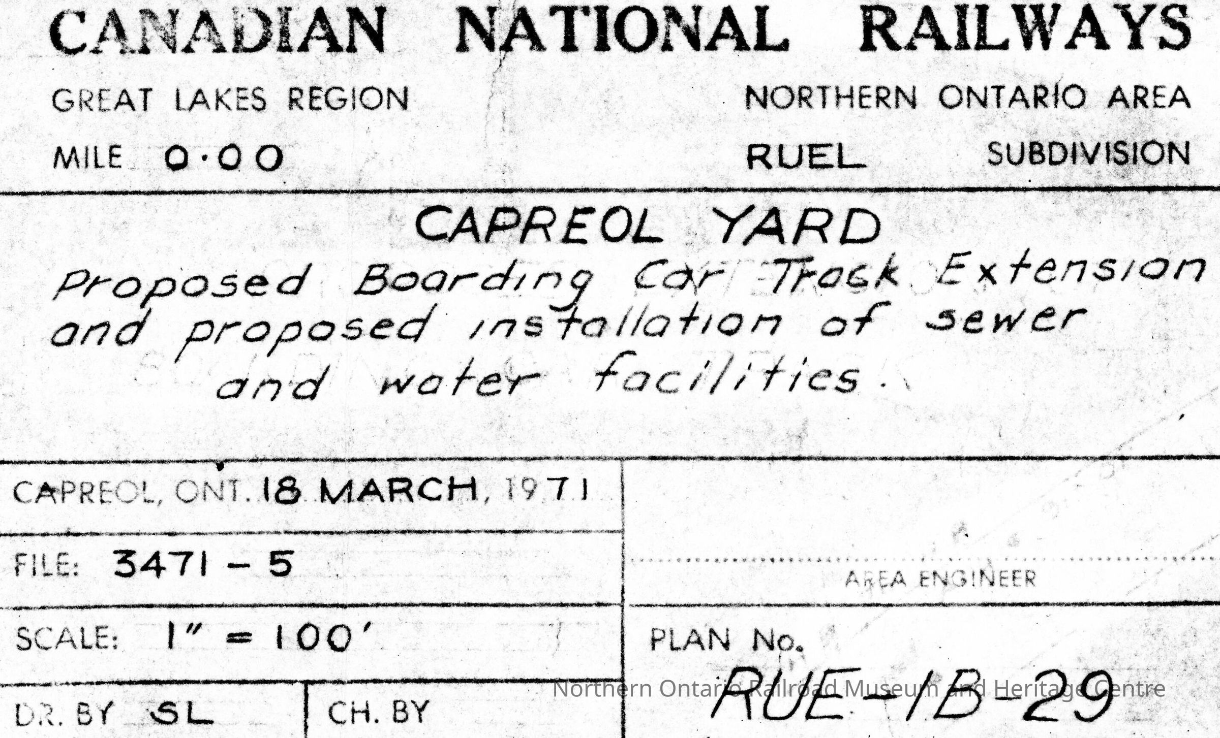 Plan published by Canadian National's Great Lakes Region, Northern Ontario Area for the Ruel Subdivision of Capreol, at Mile 0.00. The plan is for a proposed boarding car track extension and proposed installation of sewer and water facilities. Drawn on March 18, 1971.Context