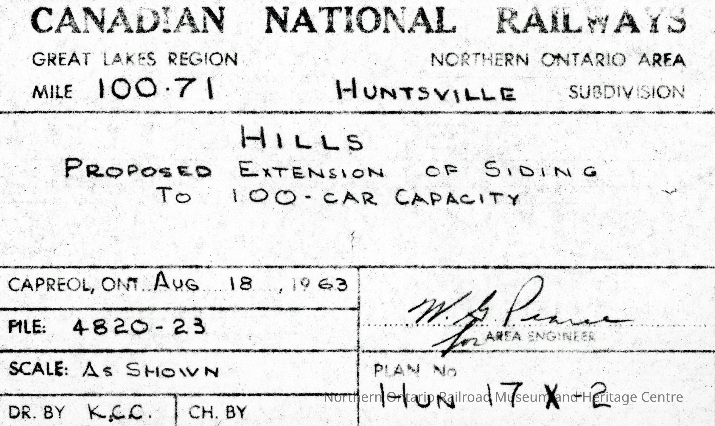 Canadian National branded plan showing the proposed siding extension to 100-Car capacity at mile 100.71 at Hills, in the Huntsville Subdivision, which is part of Canadian National's Great Lakes Region, Northern Ontario Area.Context
