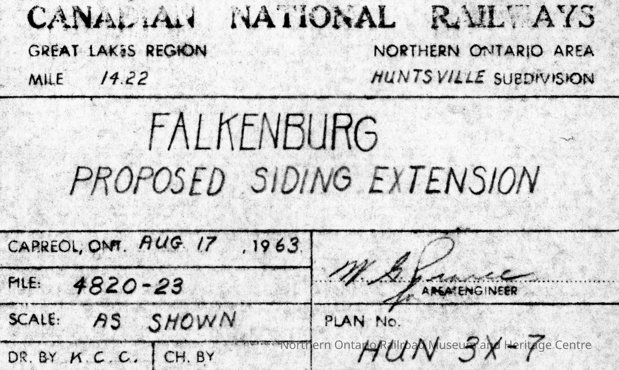 Canadian National branded plan showing the proposed siding extension at mile 14.22 at Falkenburg, in the Huntsville Subdivision, which is part of Canadian National's Great Lakes Region, Northern Ontario Area.Creator
