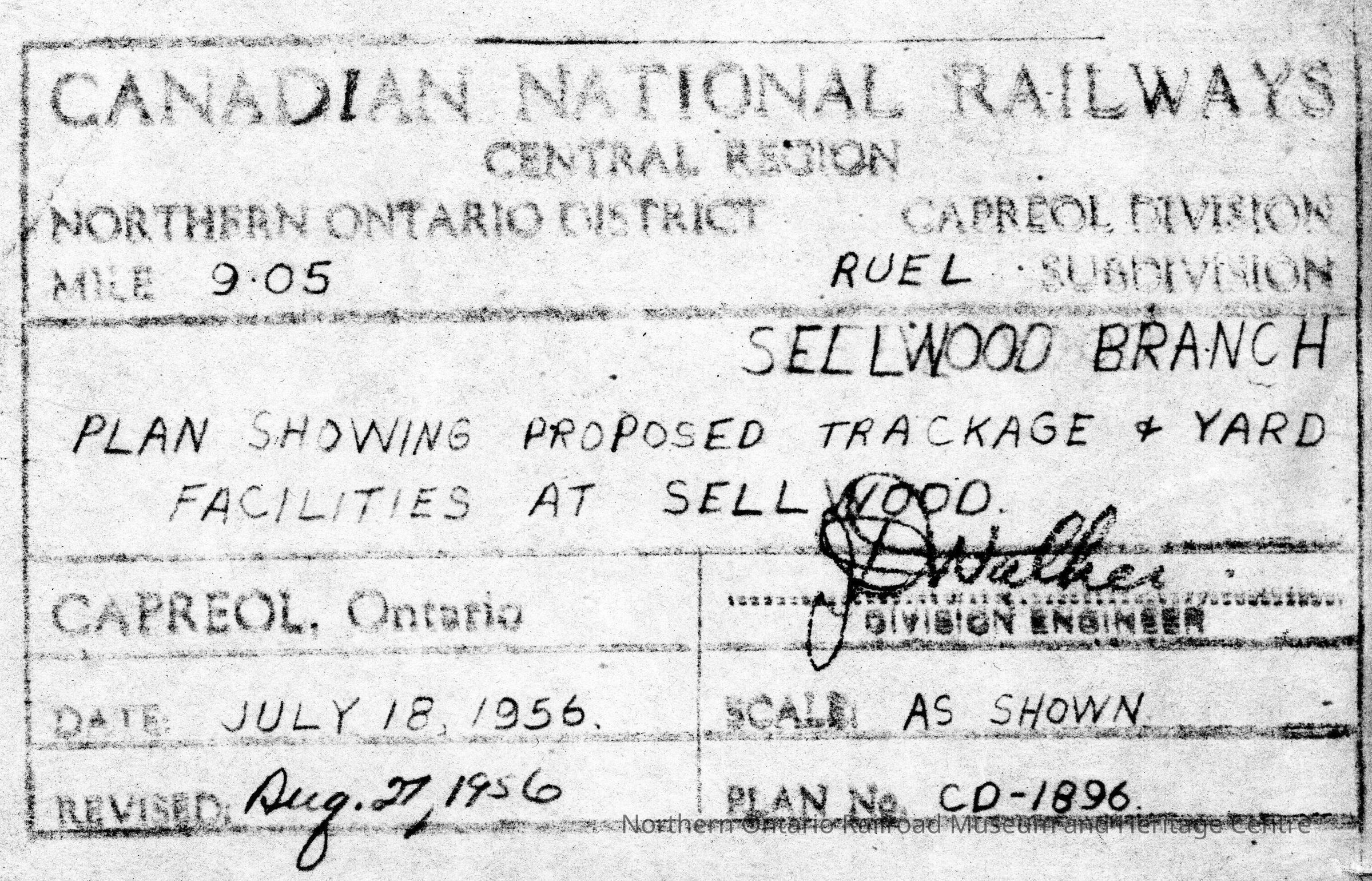 Plan created by Canadian National's Central Region, Northern Ontario District, Capreol Division.Date(s) of Creation