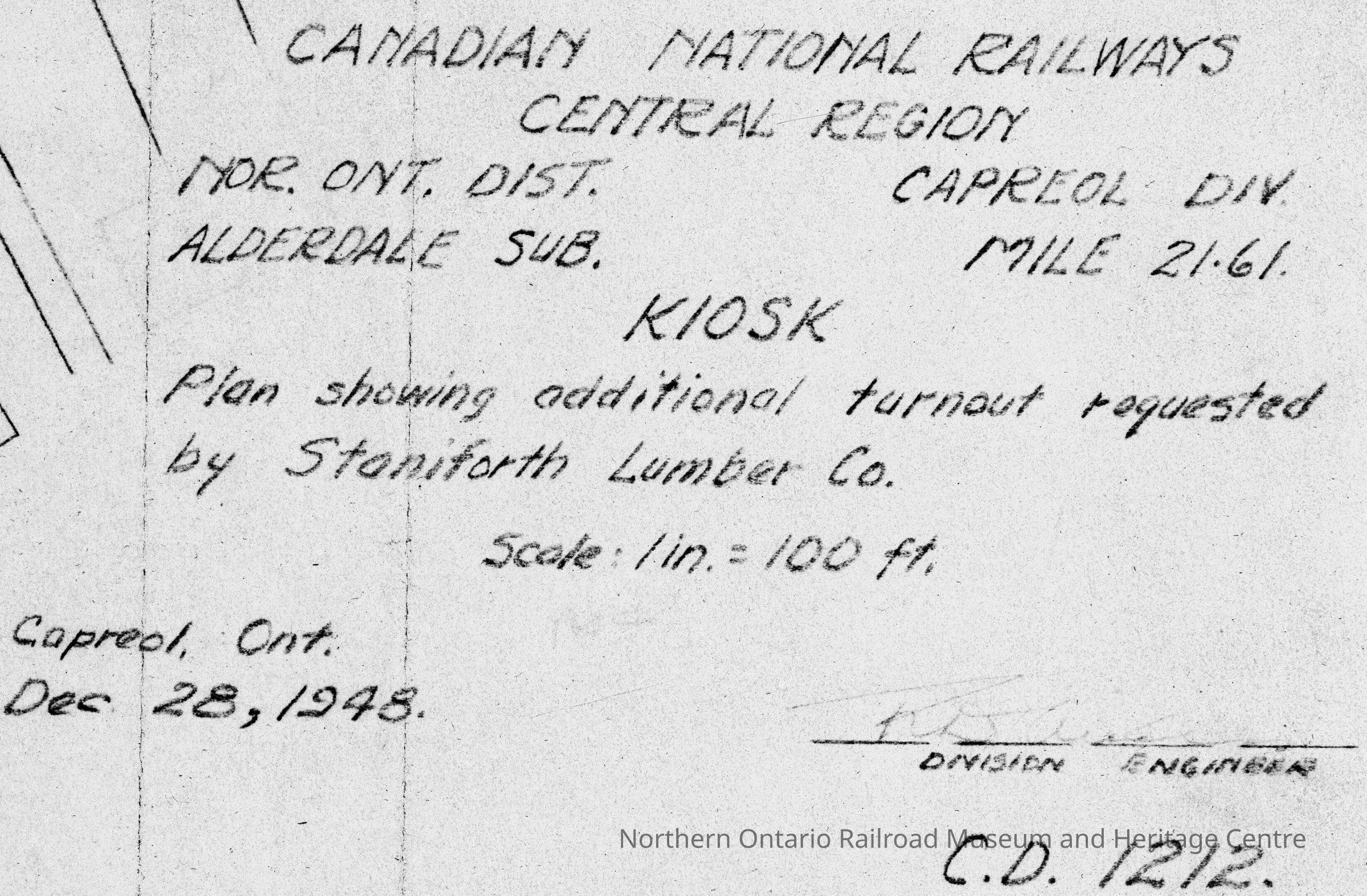 Canadian National branded plan showing the additional turnout requested by Staniforth Lumber Co at mile 21.61, Kiosk. The area is part of the Alderdale Subdivision of the Capreol Division of Canadian National's Central Region, Northern Ontario DistrictContext