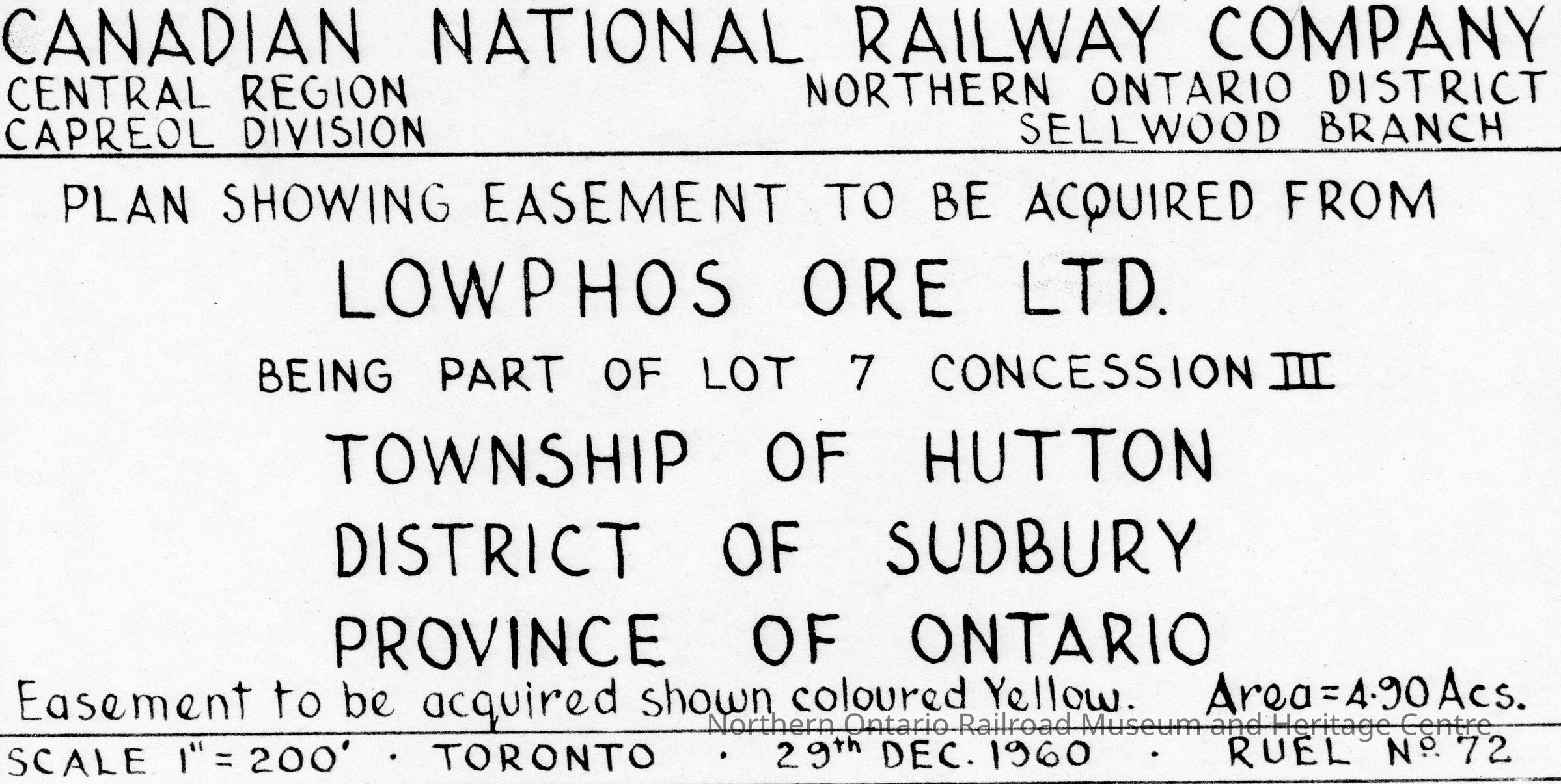 Canadian National Branded plan showing the easement to be acquired from Lowphos Ore Limited, it is part of lot 7, concession 3 in the Township of Hutton, District of Sudbury. It was completed by Canadian National's central region, Northern Ontario district, Capreol Division, Sellwood Branch.Context