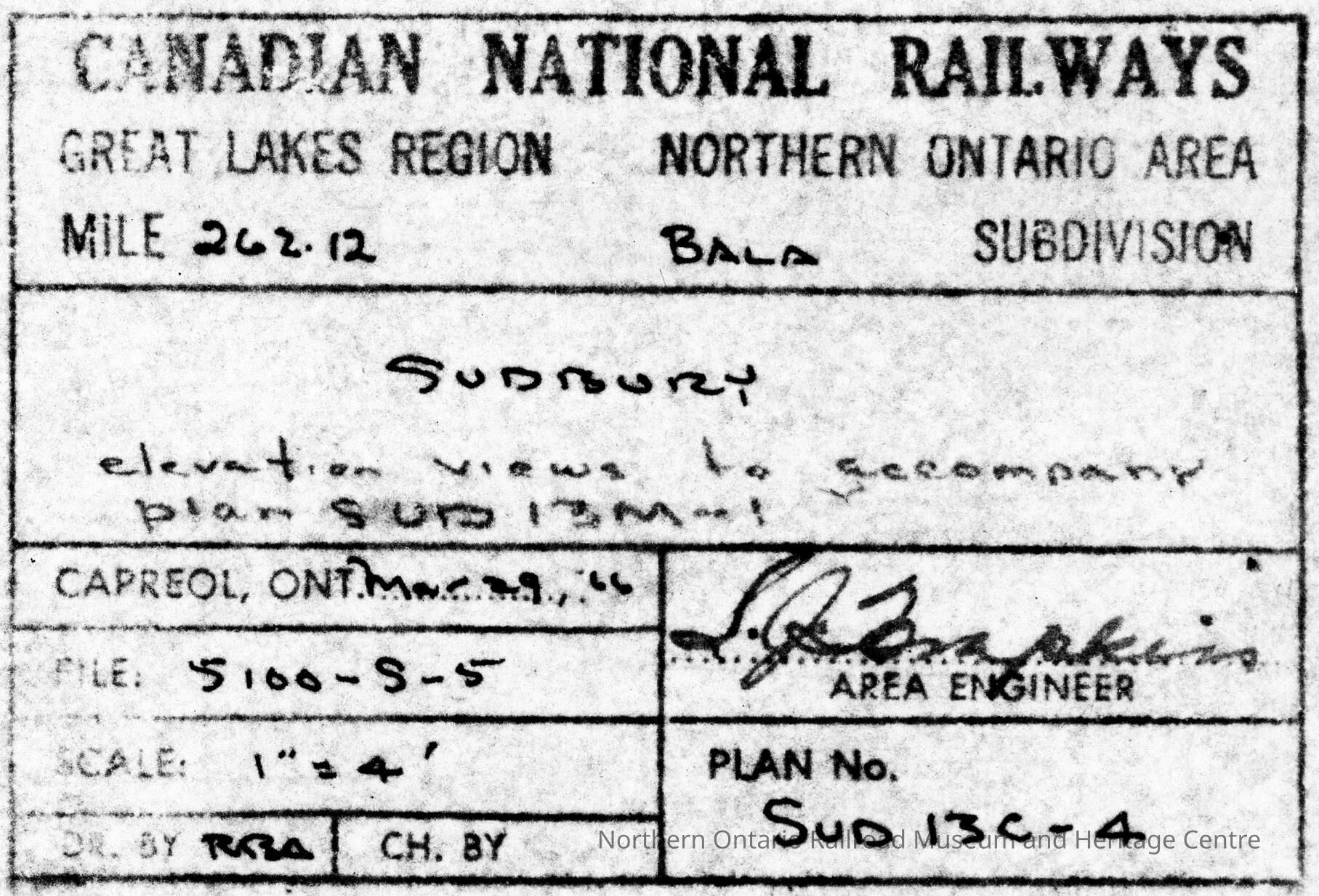 Canadian National branded plan showing the elevation views to accompany the plan spurs 13M at mile 262.12, Sudbury. The area is part of the Bala Subdivision of Canadian National's Great Lakes Region, Northern Ontario Area.Context