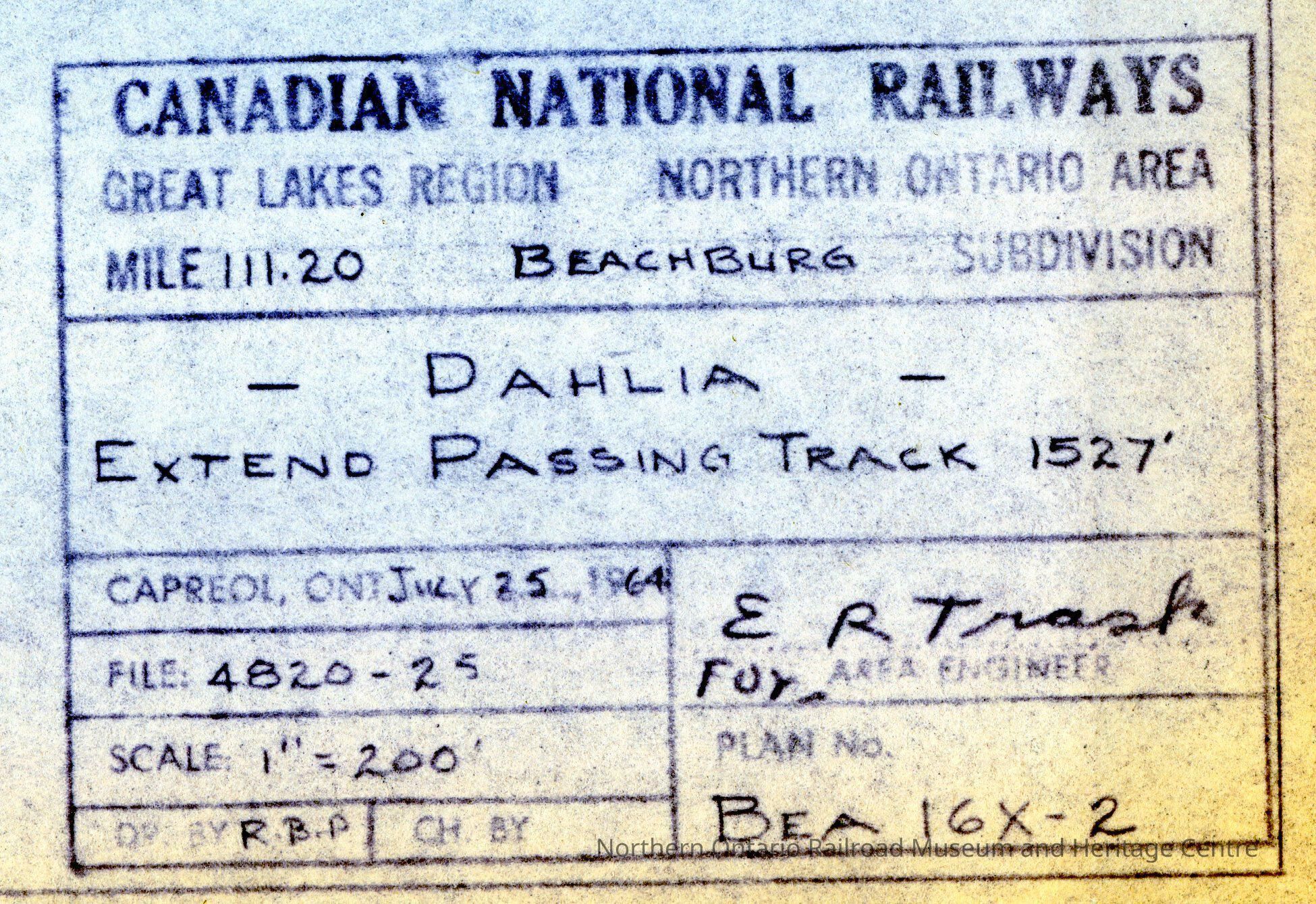 Canadian National branded plan showing the extended passing track, 1527' at Dahlia, mile 111.20. The area is part of the Beachburg Subdivision of Canadian National's Great Lakes Region, Northern Ontario AreaCreator