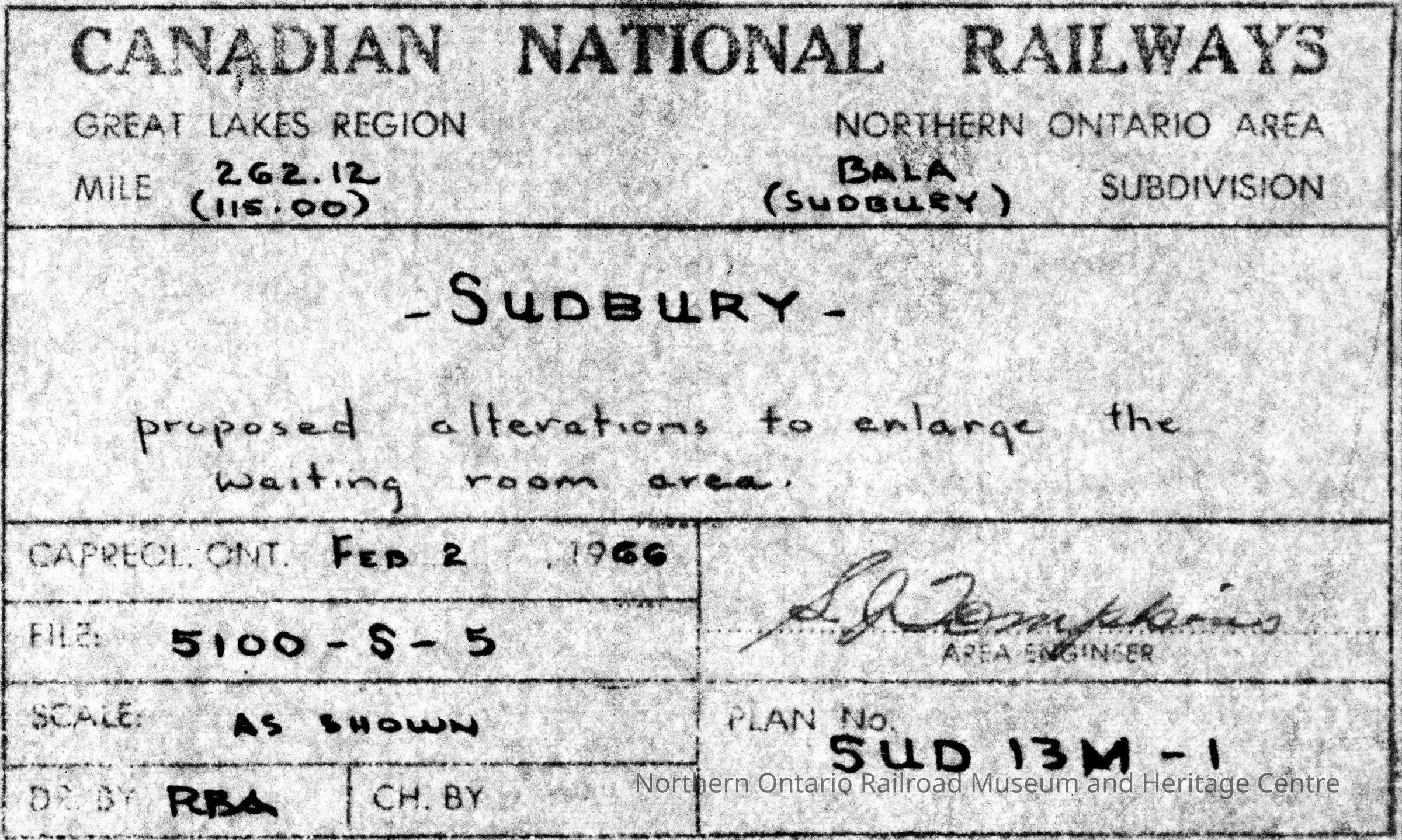 Canadian National branded plan showing the proposed alterations to enlarge the waiting room area at the Sudbury Station, mile 262.12. The area is part of the Bala Subdivision of Canadian National's Great Lakes Region, Northern Ontario AreaCreator