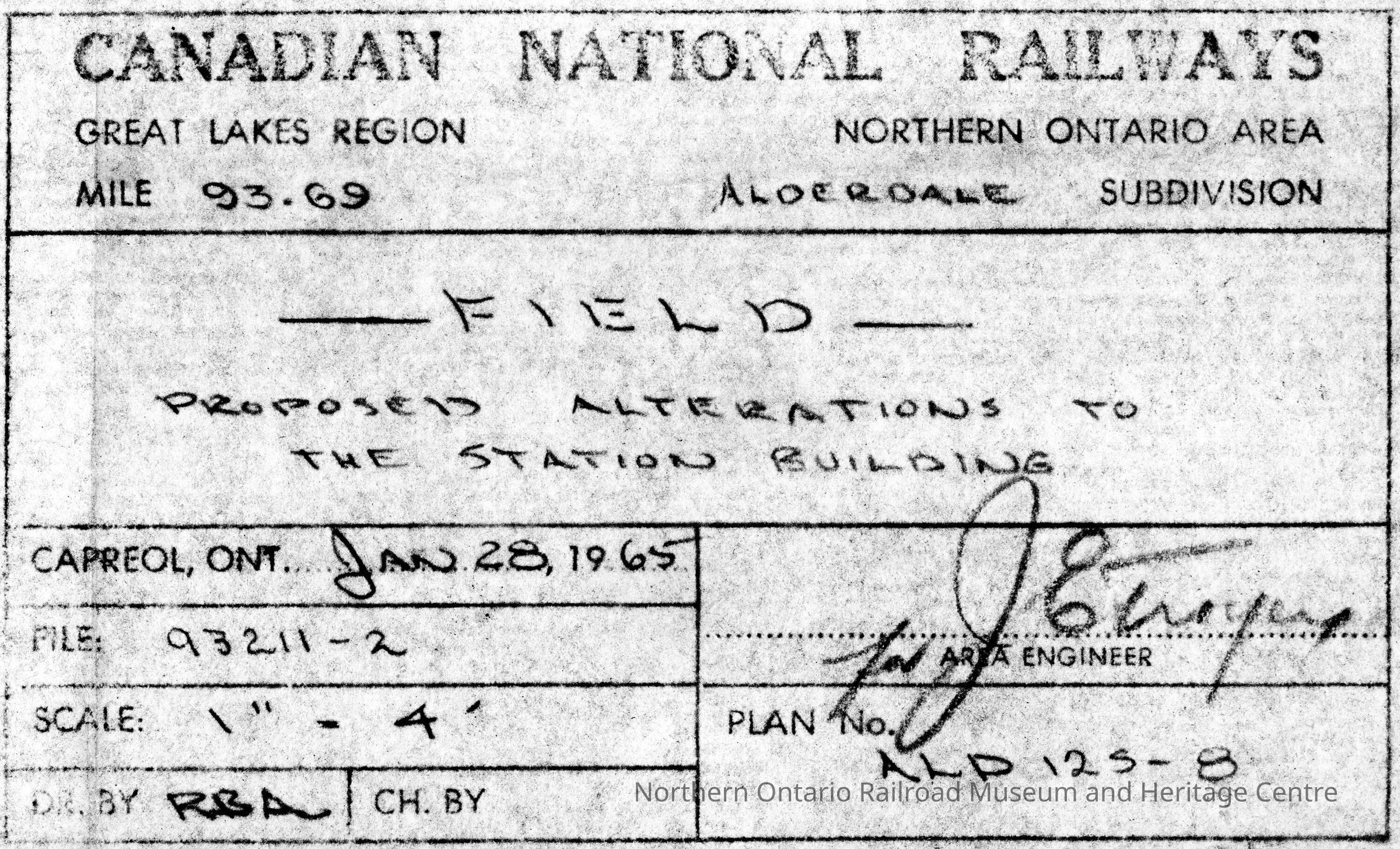 Canadian National branded plan showing the proposed alterations to the station building in Field at mile 93.69. The area is part of the Alderdale Subdivision of Canadian National's Great Lakes Region, Northern Ontario AreaContext