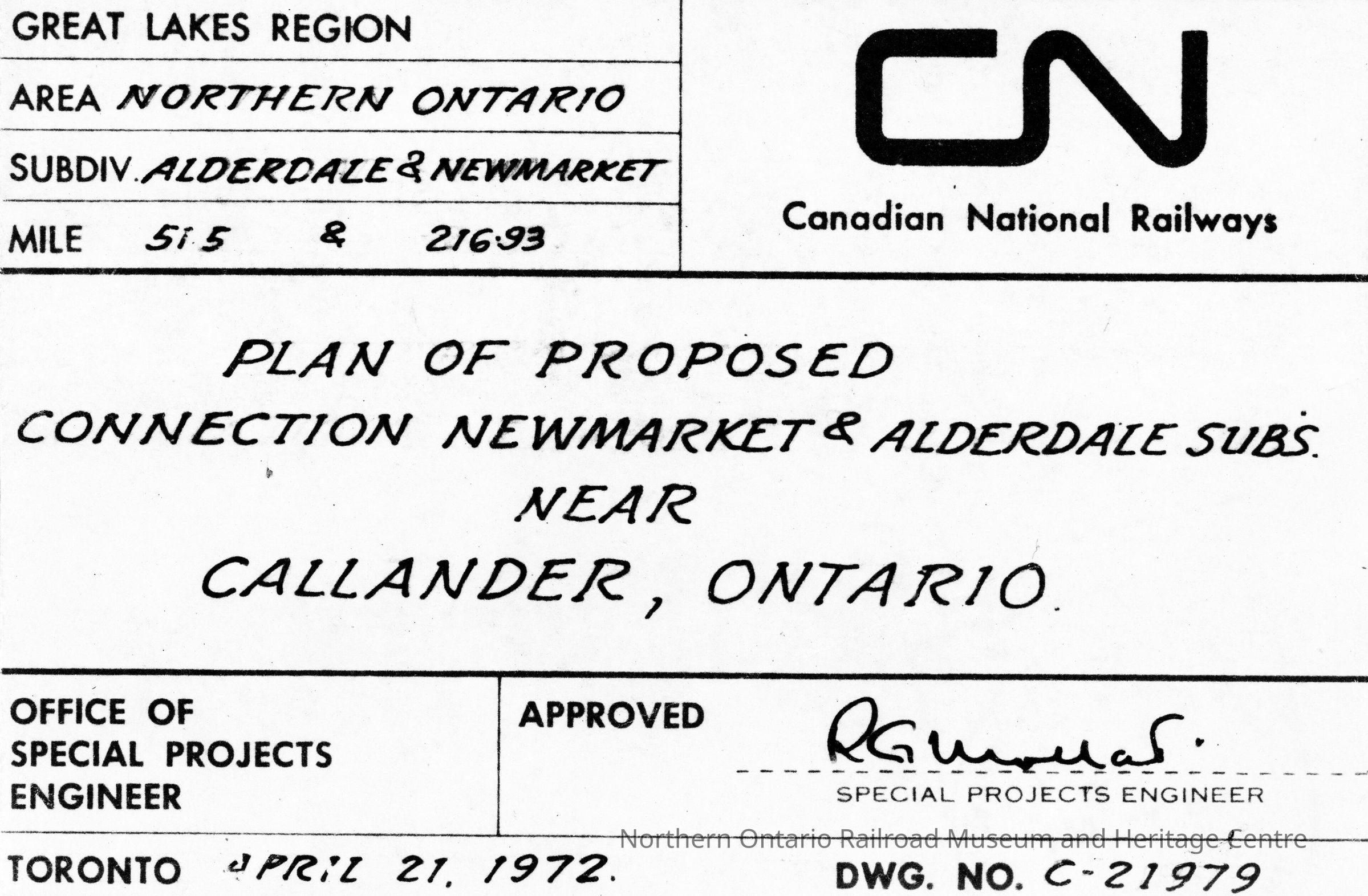 Canadian National branded plan showing the proposed connection of the Newmarket and Alderdale Subdivisions at miles 51.5 and 216.93, Callander. The area is part of both the Alderdale and Newmarket Subdivisions of Canadian National's Great Lakes Region, Northern Ontario Area.Creator