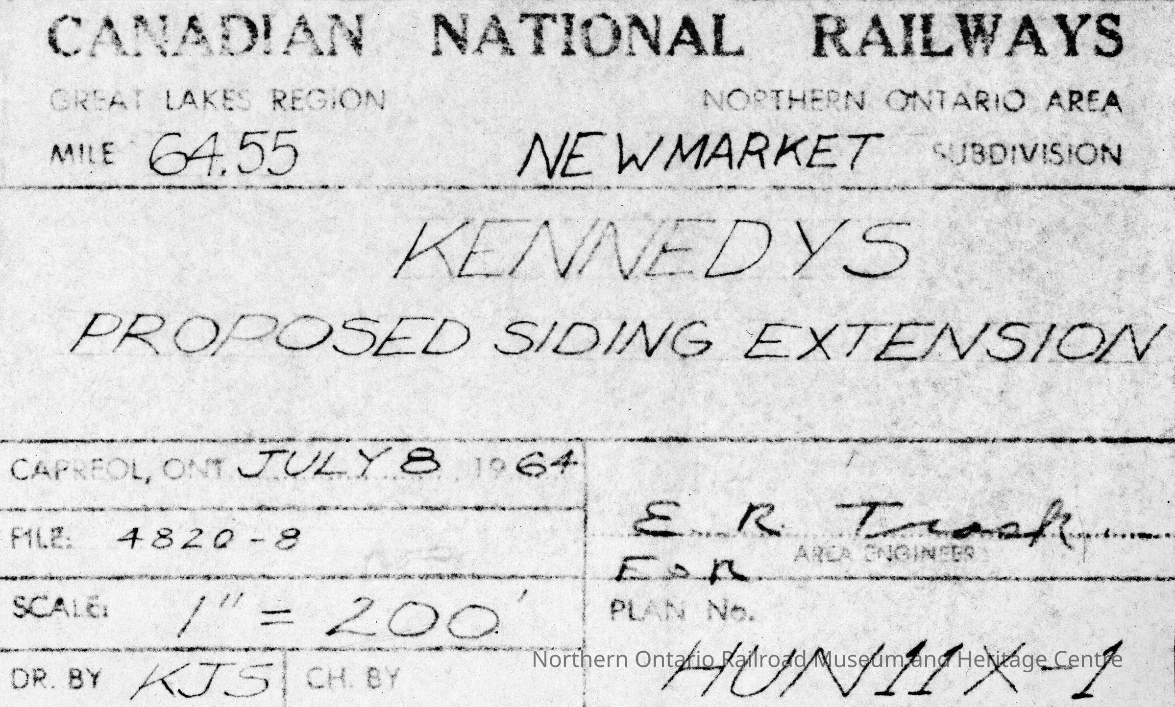 Canadian National branded plan showing the proposed siding extension at mile 64.55, Kennedys. The area is part of the Newmarket Subdivision of Canadian National's Great Lakes Region, Northern Ontario Area.Creator