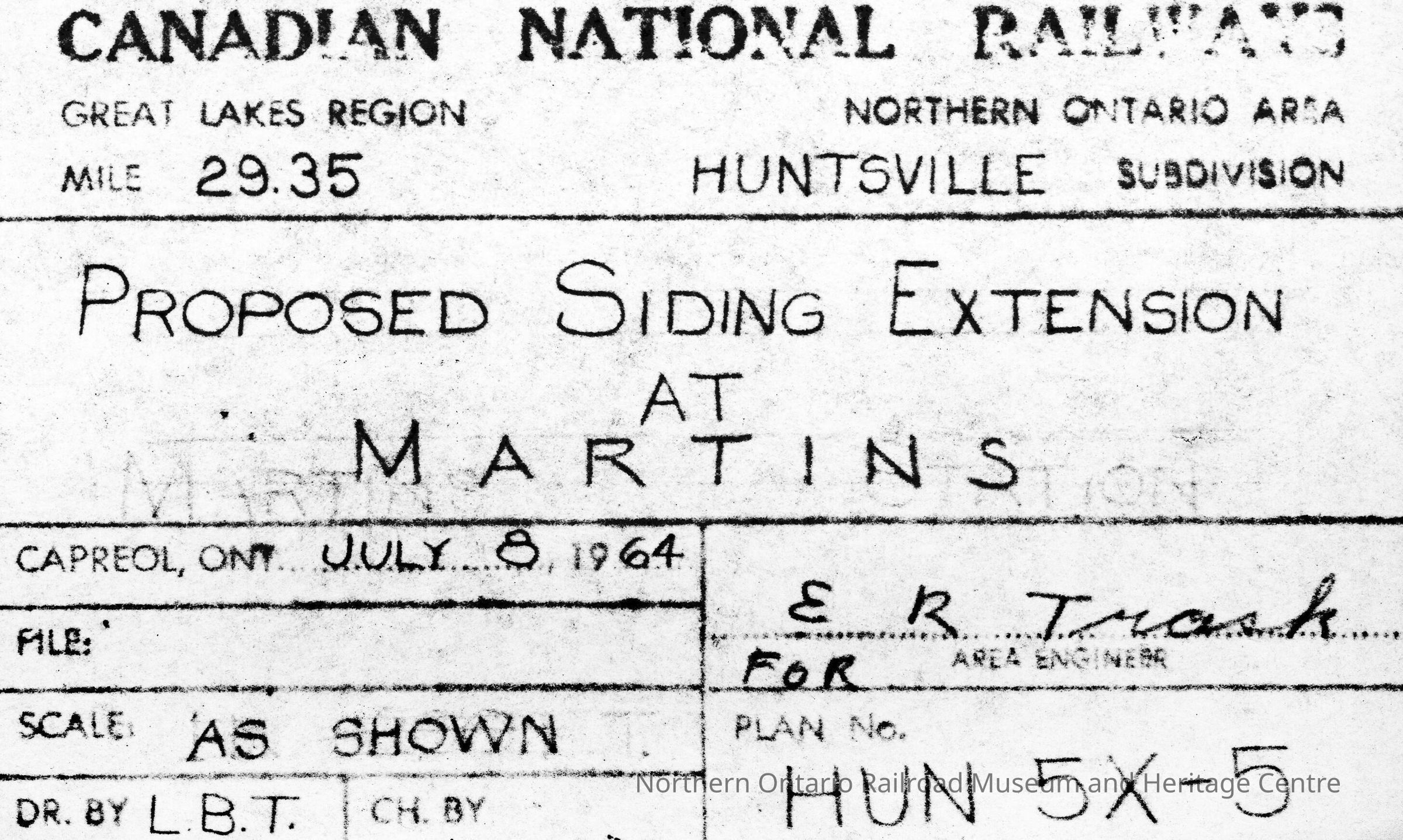 Canadian National branded plan showing the proposed siding extension at mile 29.35, Martins. The area is part of the Huntsville Subdivision of Canadian National's Great Lakes Region, Northern Ontario AreaContext