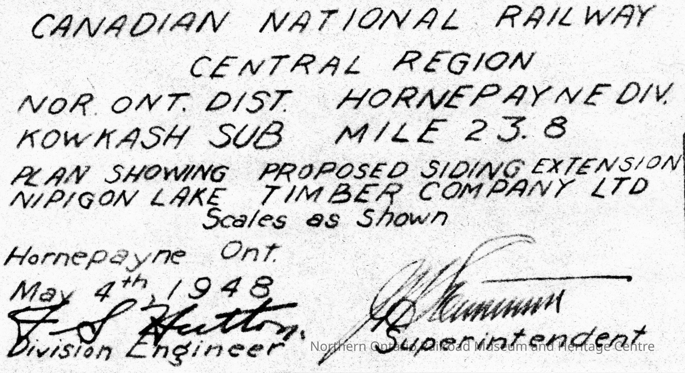 Canadian National branded plan showing the proposed siding extension for the Nipigon Lake Timber Company at mile 23.8, Hornepayne. The area is part of the Kowkash Subdivision of the Hornepayne Division of Canadian National's Central Region, Northern Ontario DistrictContext