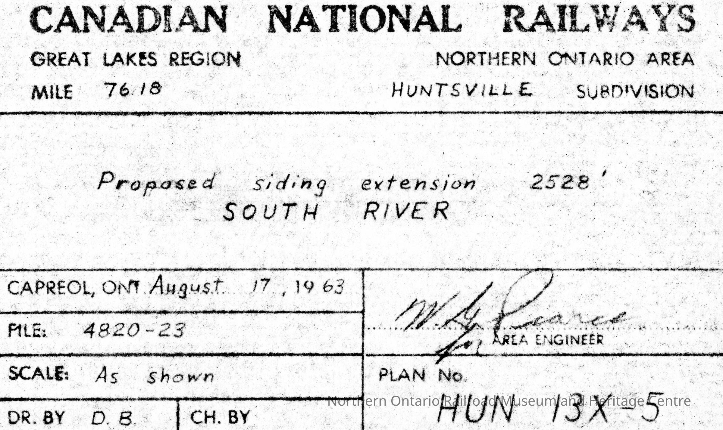 Canadian National branded plan showing the proposed siding extension of 2528' at mile 76.18 at South River, in the Huntsville Subdivision, which is part of Canadian National's Great Lakes Region, Northern Ontario Area.Context