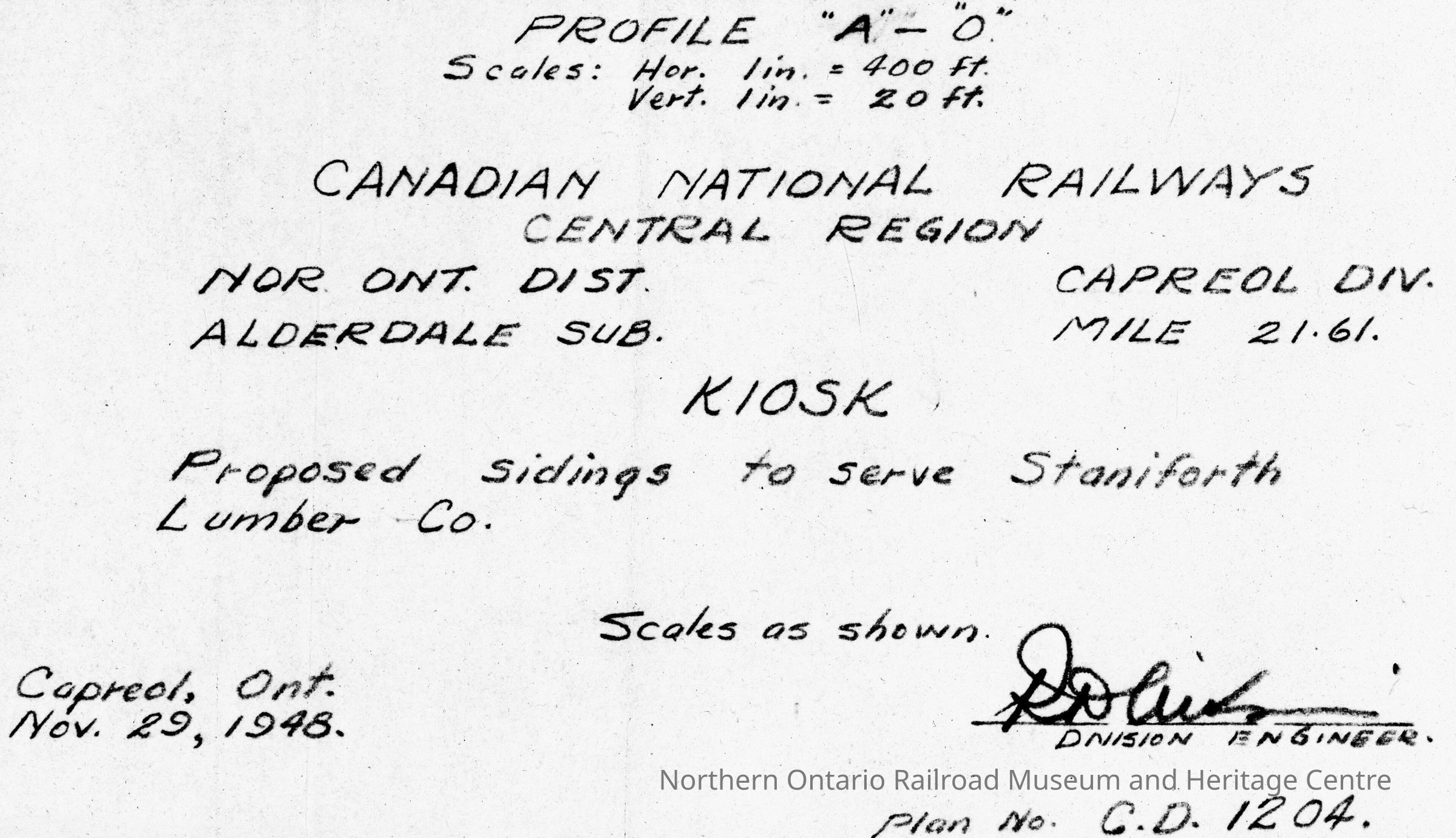 Canadian National branded plan showing the proposed sidings to serve the Staniforth Lumber Co at mile 21.61, Kiosk. The area is part of the Alderdale Subdivision of the Capreol Division of Canadian National's Central Region, Northern Ontario DistrictContext