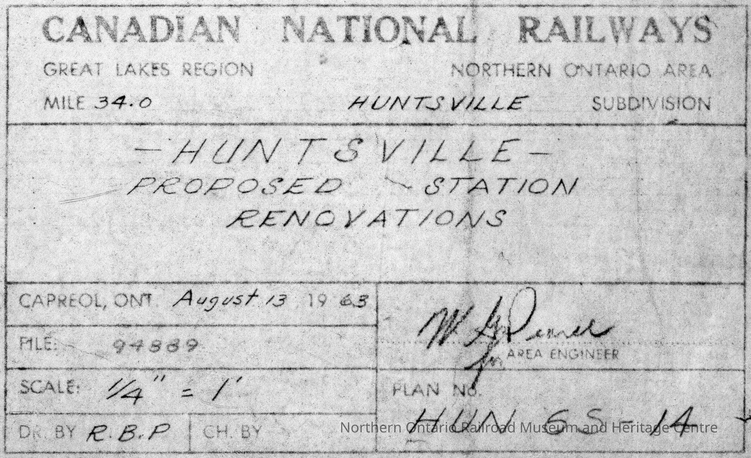 Canadian National branded plan showing the proposed renovations for the Huntsville Station at mile 34.0. The station is part of the Huntsville Subdivision of Canadian National's Great Lakes Region, Northern Ontario AreaContext