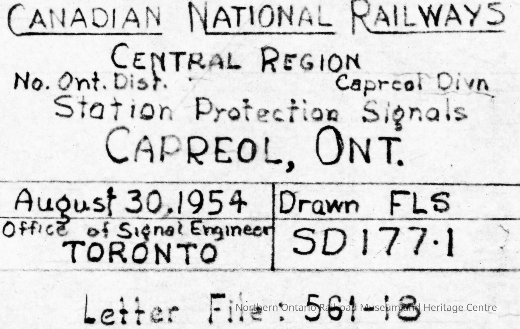 Canadian National branded plan showing the station protection signals at Capreol. The area is part of the Capreol Division of Canadian National's Central Region, Northern Ontario DistrictContext