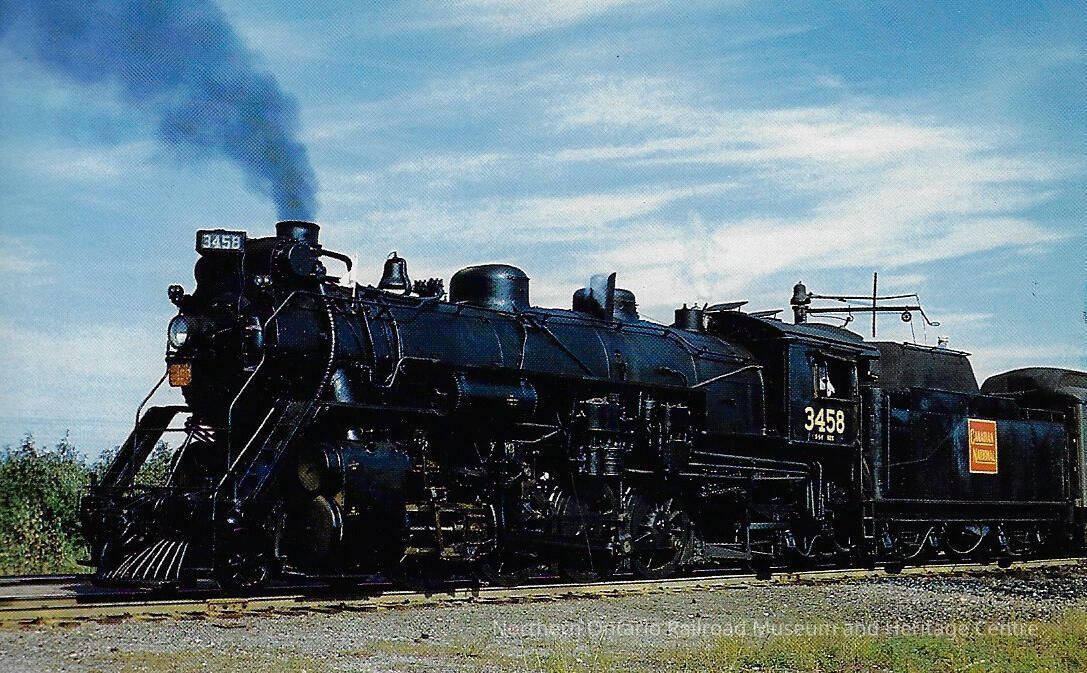 Canadian National postcard showing Mikado Steam Engine #3458 at Orillia, Ontario in 1956. The front image shows the front and left side of the locomotive, meaning the tender, and engine are visible.