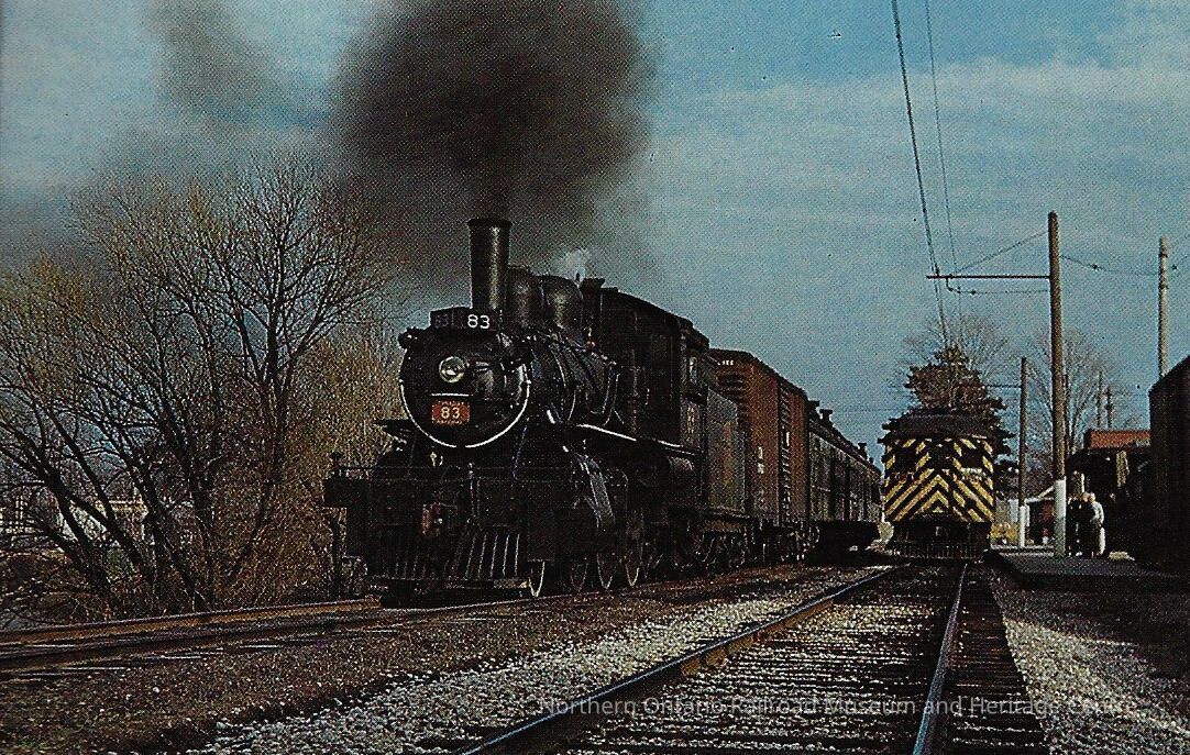 Canadian National postcard showing Mogul steam engine #83 in Port Dover, Ontario, in 1955.