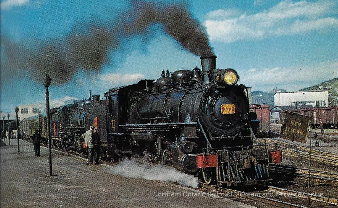 Canadian National postcard showing steam engine #317 departing St. John's, Newfoundland, in 1956. The front image shows the front and right side of the train, the engine, tender, and passenger cars are visible. It is also pulling another engine.